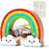 🌈💰 Adorable Wooden Rainbow Piggy Bank-This delightful piggy bank features a charming rainbow design that brings a burst of color and joy to any space. The top is adorned with a vibrant, multi-colored rainbow arching across the sky, while the bottom is decorated with cute, smiling clouds that add a touch of whimsy and wonder. The cheerful hues and playful expressions are perfect for sparking imagination and making saving money a fun, magical experience for kids and adults alike.