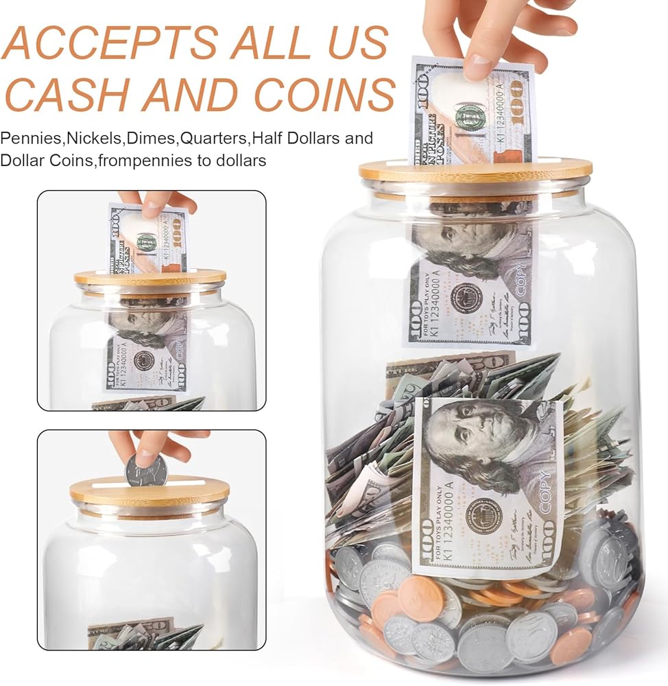 • ✅Money Bank with Slotted Lid: The clear openable large money coin jar can accommodate all U.S. circulating coins, currency. including pennies, nickels, dimes, quarters, half-dollars, and dollar coins. The money container is great for a change “jar” organizer, tips jar, donation jar for fundraisers for arts, crafts, decoration, party favors, and more.