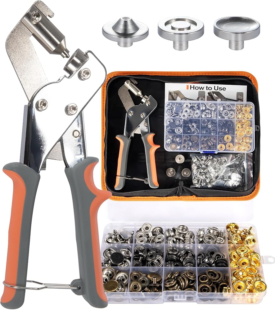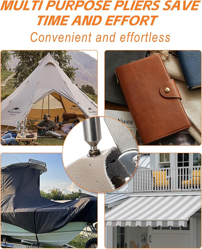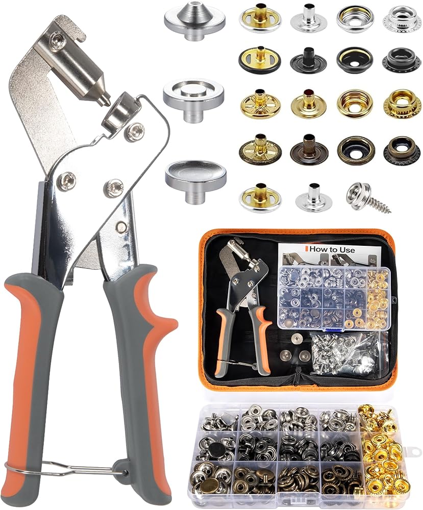 【ALL-IN-ONE PREMIUM SNAP KIT】 Our upgraded snap fastener tool kit includes 1 steel installation tool, 3 magnetic interchangeable dies, 100 sets of stainless steel snaps (20 gold, 20 silver, 20 copper, 20 black, plus 20 silver screw-on snaps), and a durable storage case. Perfect for boat covers, tarps, canvas, leather, and DIY projects—everything you need in one portable package!