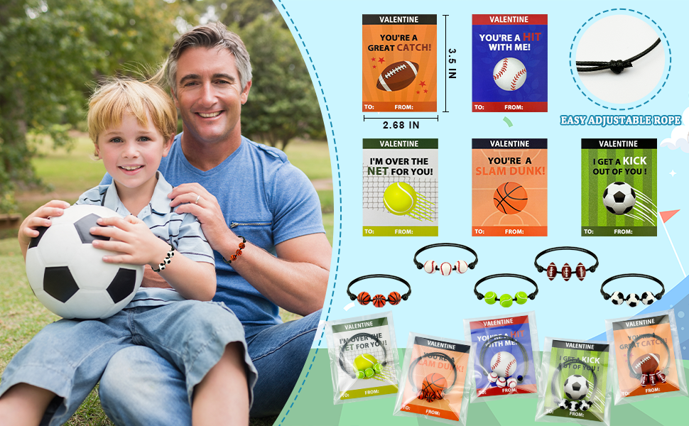 30-Pack Valentine's Day Sport Bracelets – Includes 30 adjustable sport bracelets (6 soccer, 6 basketball, 6 tennis, 6 baseball, 6 football) and matching greeting cards.Perfect for classroom Valentine's exchanges, school parties.
