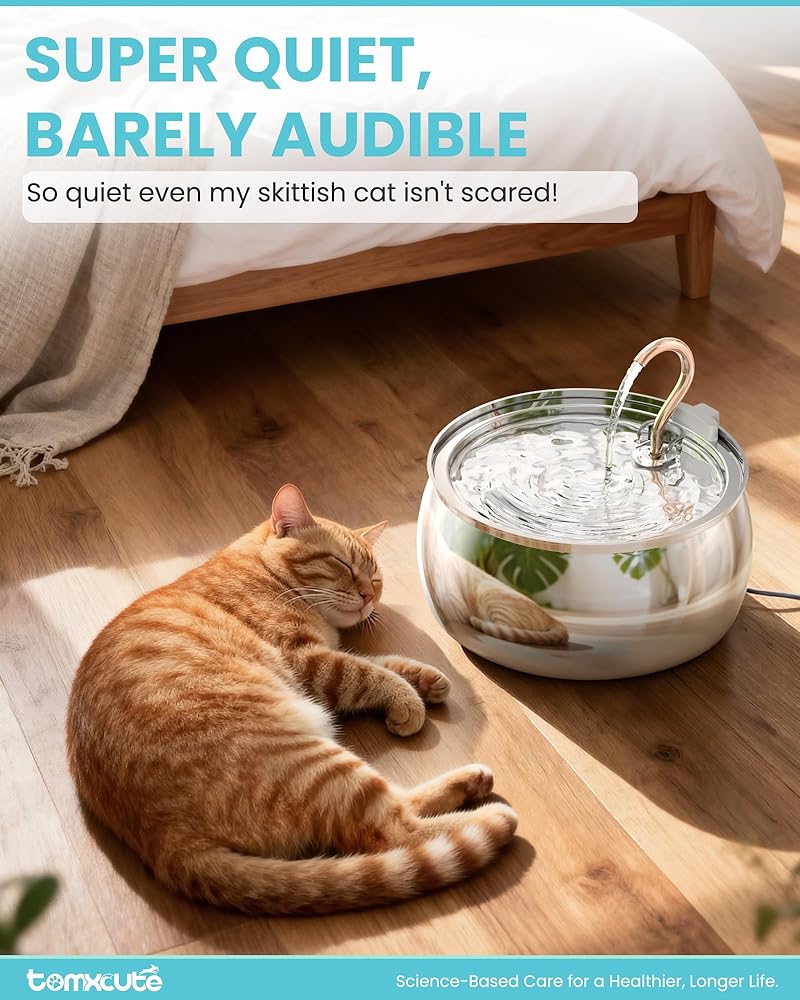 Super Quiet, Barely Audible - "So quiet even my skittish cat isn't scared!" Equipped with a low consumption 5V pump that operates at a gentle ≤ 25dB, this fountain gives your pets a peaceful drink environment, without any disturbance both for you and your furry friends.