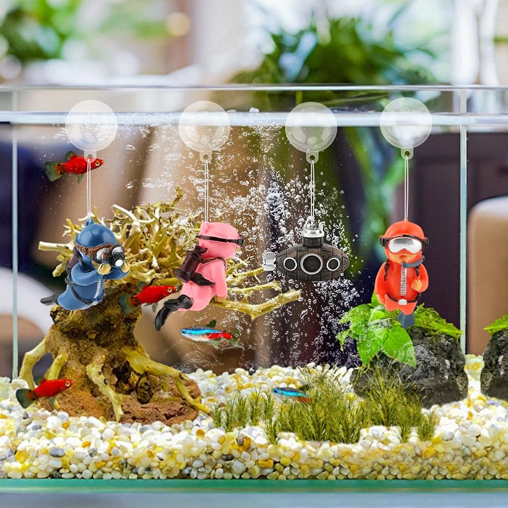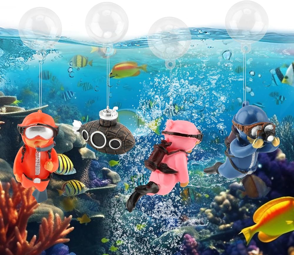 1.Floating Aquarium Decoration Set: Floating Fish Tank Decorationincludes a vintage floating submarine with three cute divers, four clear floats and four bundles of elastic crystal wire