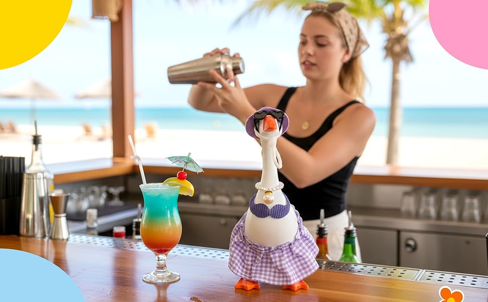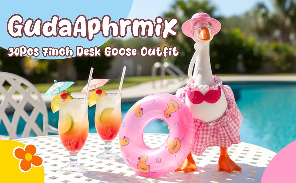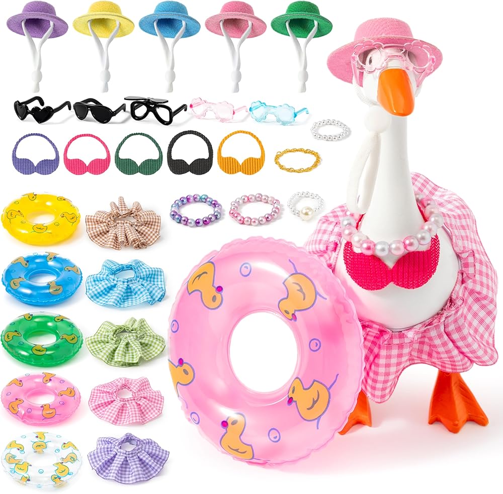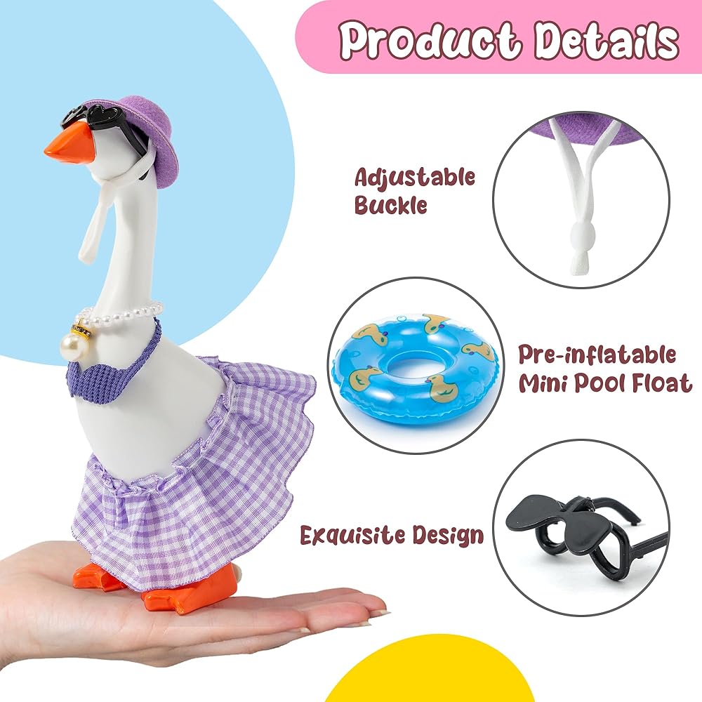 [Fun & Versatile Decor] Beyond serving as decorative goose ornaments for tabletops, these animal outfits can also be used to dress up small pet figurines such as hamsters and ducks. Whether for summer goose decorations, party accessories, or creative photography, the diverse range of swimming rings, dresses, hats, and sunglasses offers endless styling possibilities. Transform your porch-side goose into a festive focal point or a comical social media star with these versatile animal costumes.