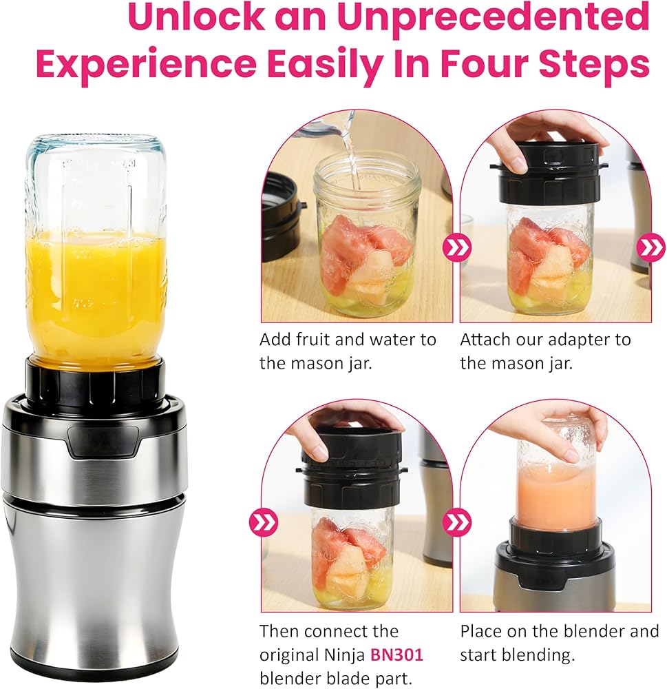 ⚠️ NOTE: The adapter is compatible with the 900-watt Ninja BN301 blender and Ball brand wide mouth mason jars, including the 16oz, 32oz and 64oz sizes. Please confirm the model information before purchasing.
