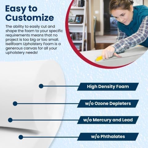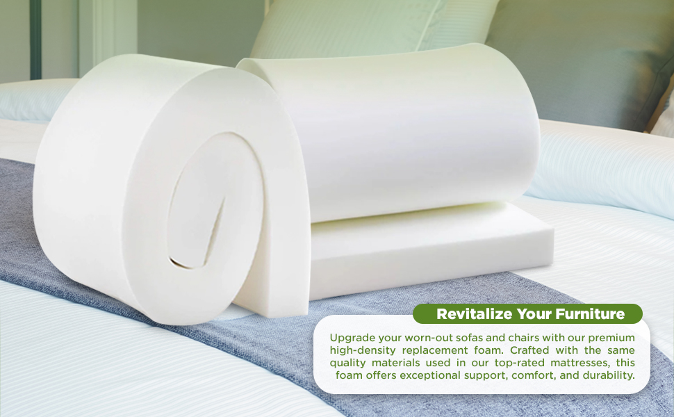 HIGH-DENSITY FOAM: Our upholstery foam high density is the perfect solution for reviving your home and outdoor furnishings. With a 1.8 high density and a 52lb. compression rate, this deluxe firm upholstery foam offers durability, ensuring your furniture regains its original comfort and shape. Ideal for a wide range of applications, including sofa cushion foam, chair pads, and patio furniture cushions, expect remarkable longevity of 7-12 years depending on usage.