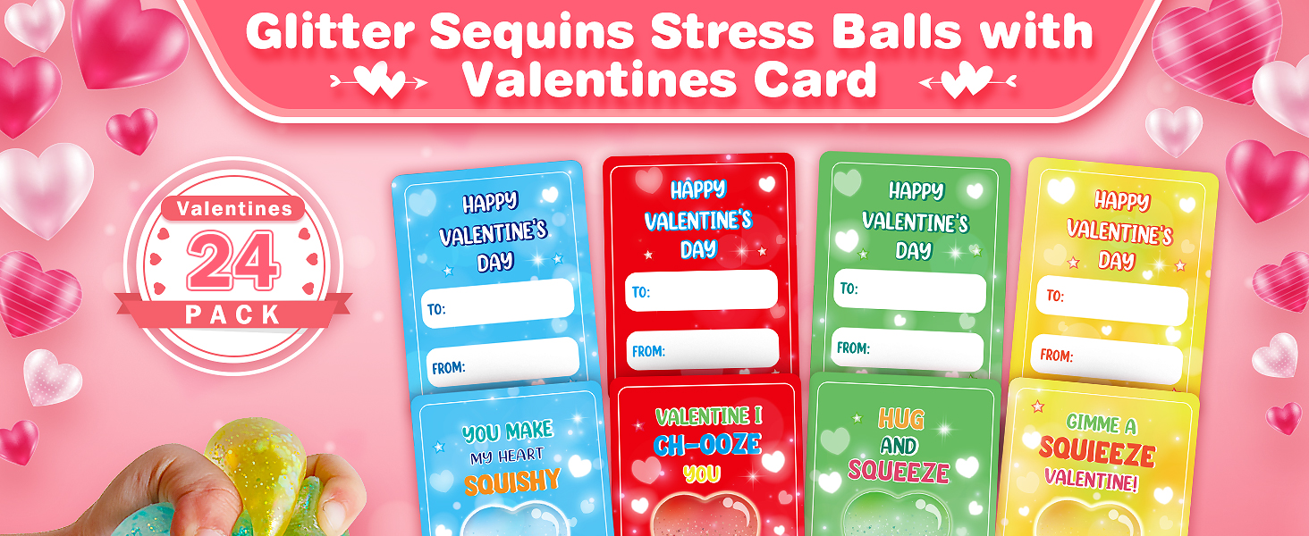 Valentines Day Gifts Cards for Kids, 24 Pack Heart Stress Balls with Greeting Cards, Stretchy Toy Balls Bulk Gift for Kids Classroom Exchange Prizes, Squeeze Fidget Toys for Party Favor