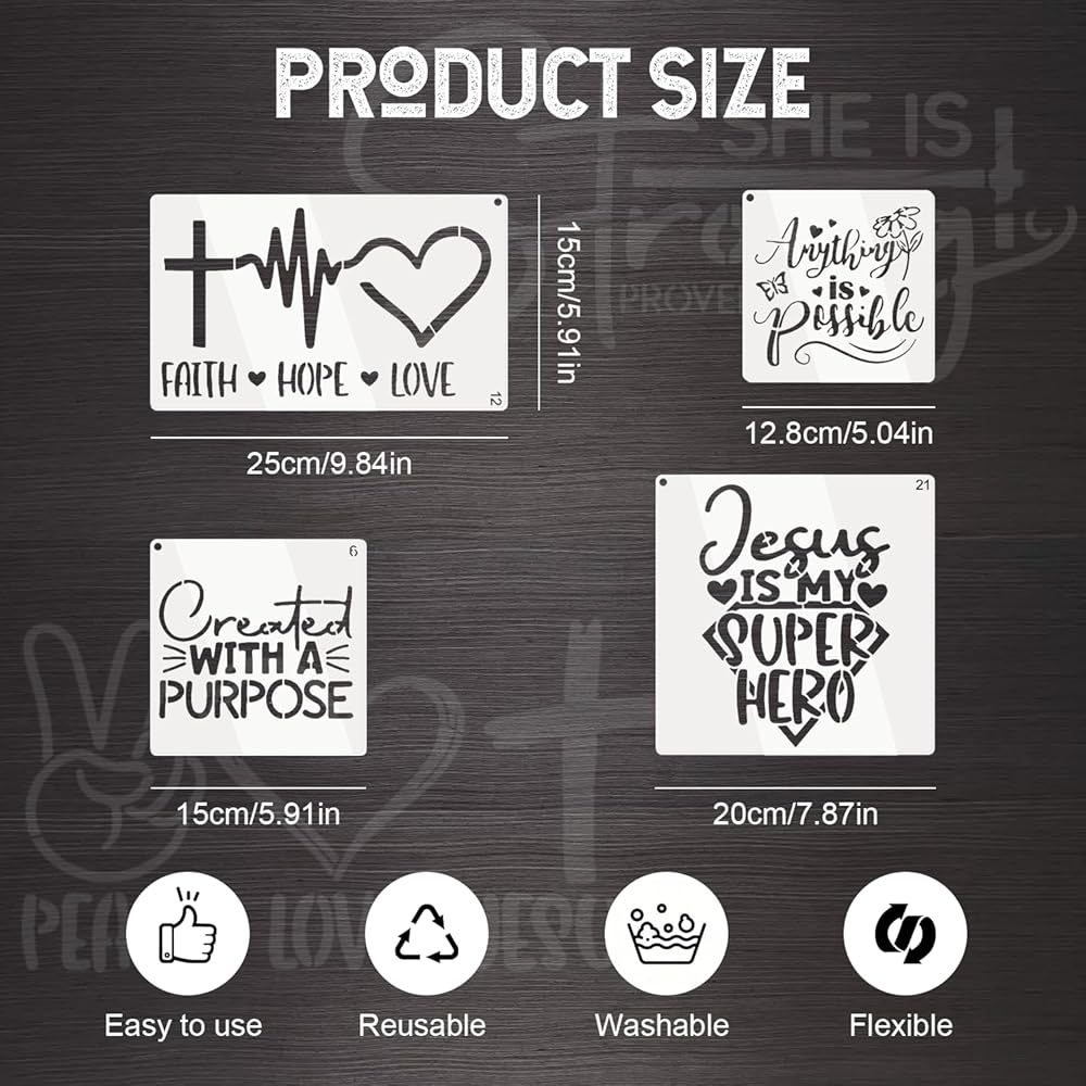 【Inspirational Word Stencils Set】Includes 24 pieces of motivational word templates in varied sizes: 6 pieces of 5.11"×5.11", 4 pieces of 9.84"×5.9", 6 pieces of 5.9"×5.9", and 8 pieces of 7.87"×7.87". Multiple sizes and styles meet all your DIY craft needs.