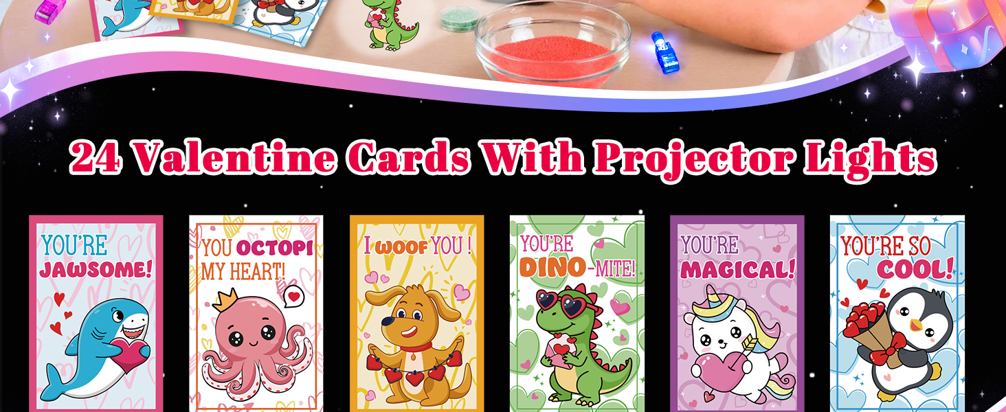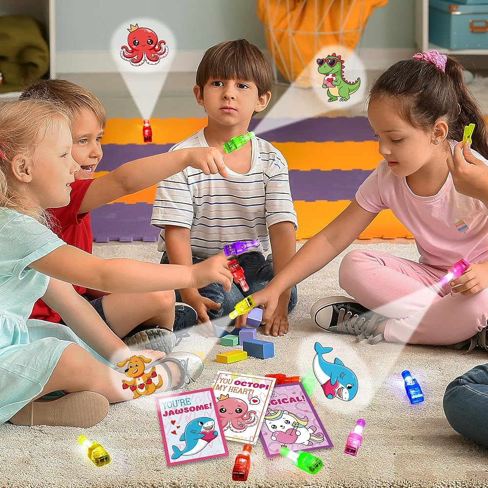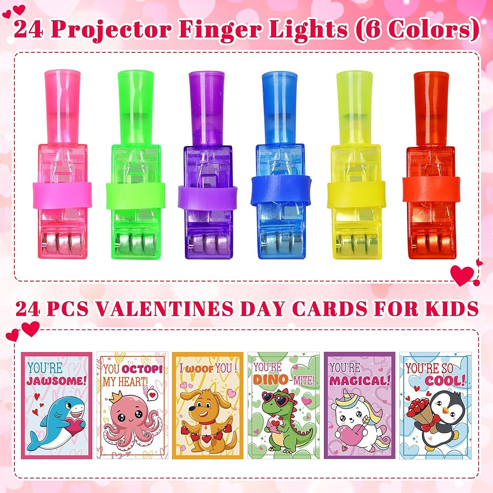 Cute Valentines Day Gifts for Kids, This card set with finger lights will be a hit for kids Valentines day. They are very bright and project the pattern out when turn on the switch, offer instant entertainment for kids valentines