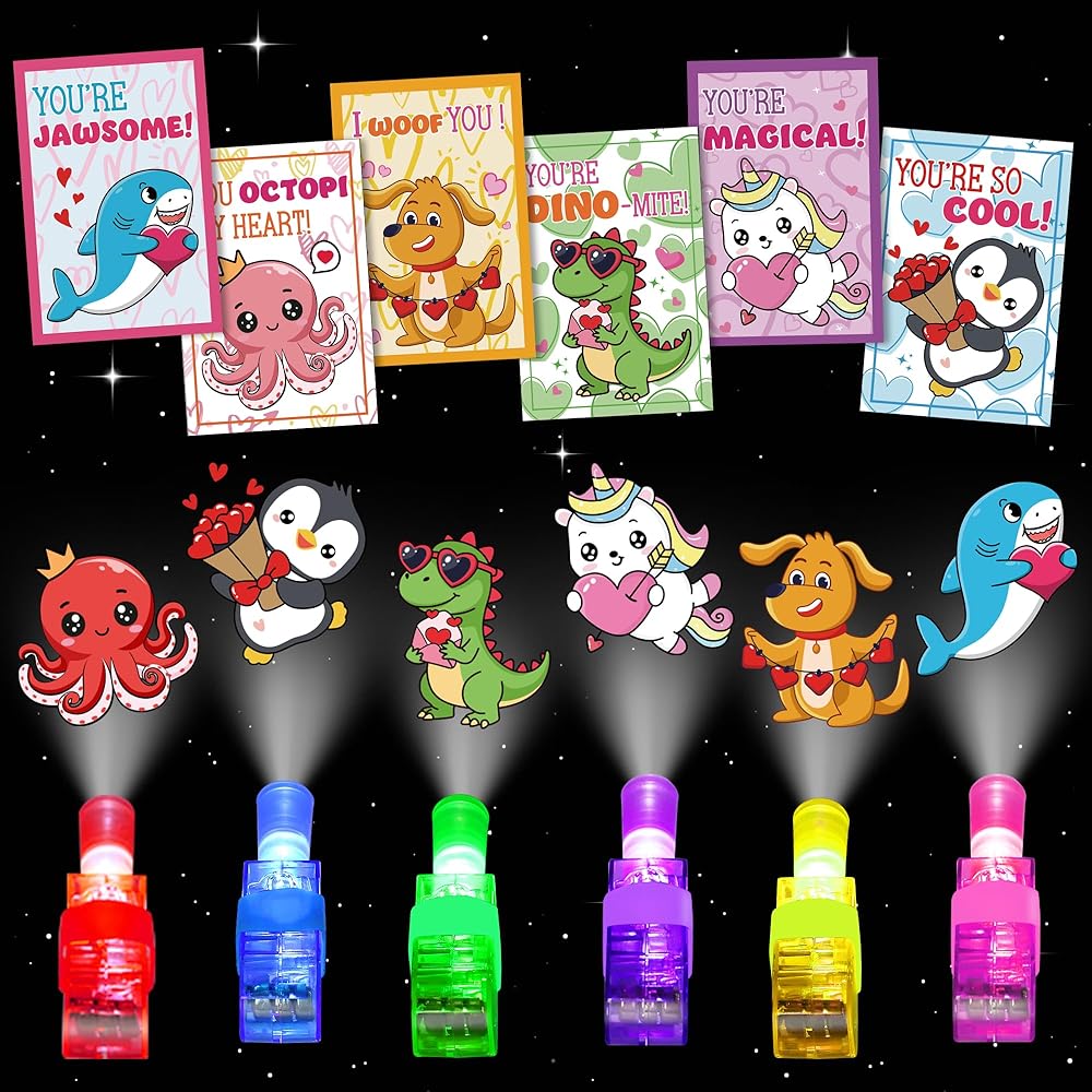 Finger Lights Valentines Day Cards for Kids School, Comes with 24 cards, 24 finger projection lights and 24 twist ties. Each card has a animal themed design which matches the projected pattern. Perfect valentines day cards for kids classroom