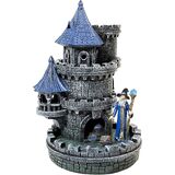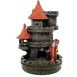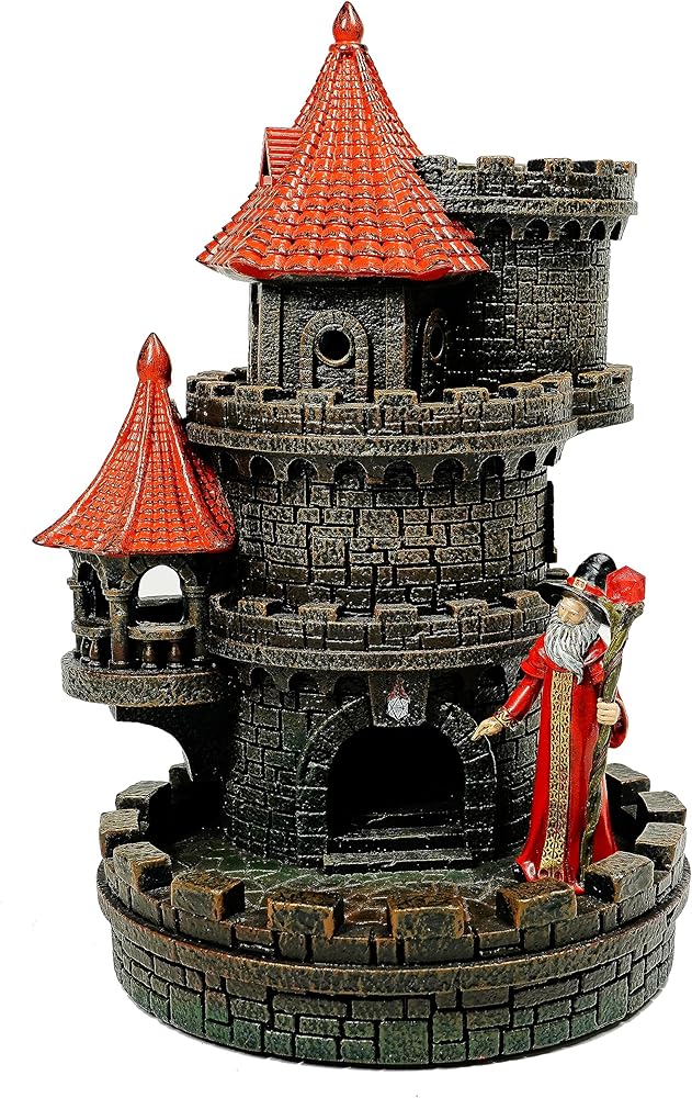 Size: Measures 11 in tall x 8 in wide x 9 in deep and fits standard-sized polyhedral dice that enter the castle tower and emerge from the lower doorway onto a paved courtyard, contained by a magical wall, visible to all.