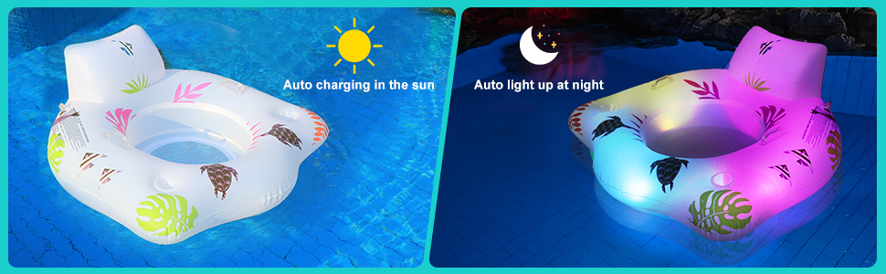 2 in 1 Pool Floats for Adults - Light up your pool and work like a charm. Our Unique & Patent chair floats for adults is a new product developed and produced by our team as a result of our Voice of the Customer program. It is not only a pool chair float, but also an amazing solar pool light. After charging during the day, it will automatically glow colorful lights at night, for you to enjoy summer pool time to the fullest.