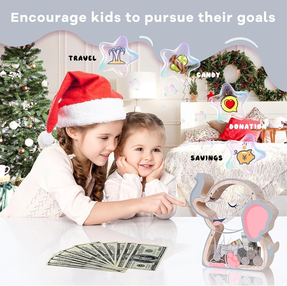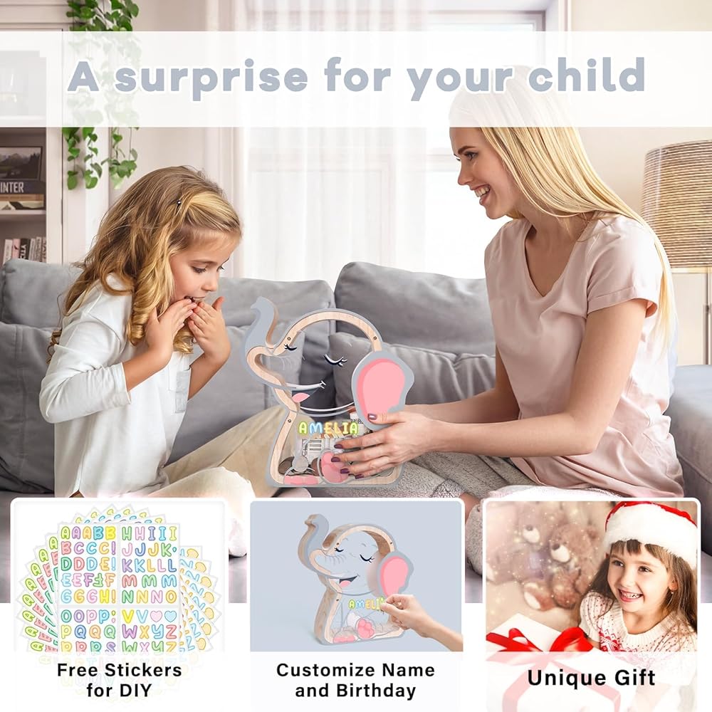 Wooden Elephant Piggy Bank for Kids, Unbreakable Elephant Kids Coin Bank with Letter Stickers, Cute Cashbox Money Jar Easter, Birthday Gifts for Boys, Girls, Educational Toys for Boys, Girls
