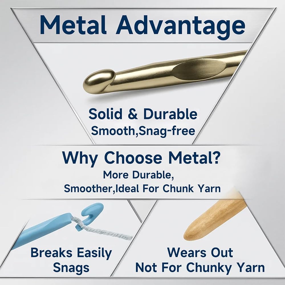 Smooth & Durable Metal Construction: Each metal crochet hook is crafted from high-quality aluminum for a smooth glide and snag-free crocheting. Stronger and longer-lasting than plastic crochet hooks or wooden crochet hooks; compatible with knitting needles and all major crochet hook sets