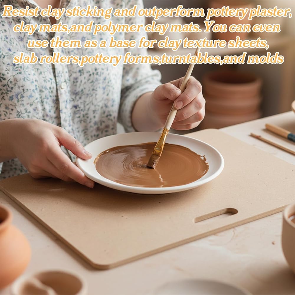 Features: This 2-pack set includes premium clay wedging boards, each measuring 17.5" x 11.8" with an 8mm thick MDF construction for lasting durability. The built-in handle ensures portability and easy storage. Featuring a smooth, non-stick surface and rounded edges, these versatile boards are perfect for pottery, ceramics, sculpting, and countless DIY art applications.