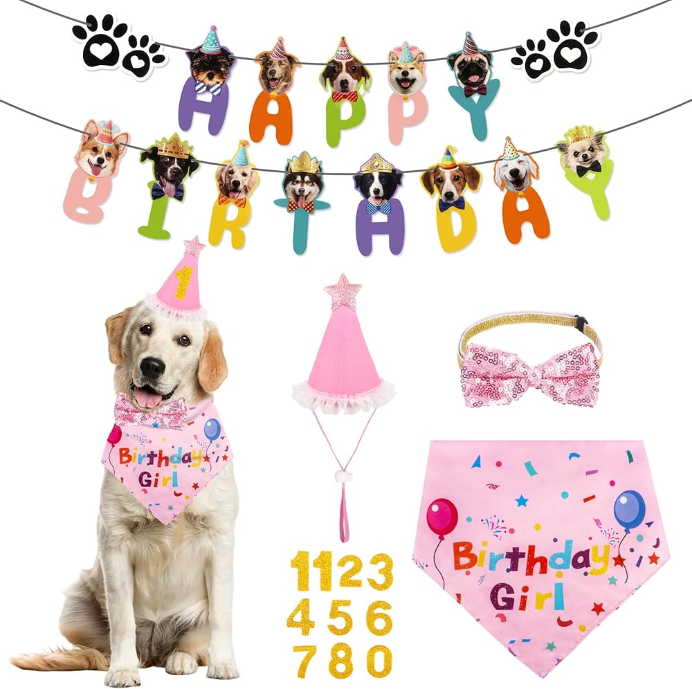 Dog Birthday Bandana for Medium Large Dogs, Dog Birthday Banner Numbers Hat Bow Tie for Dog Party Decorations, Pink