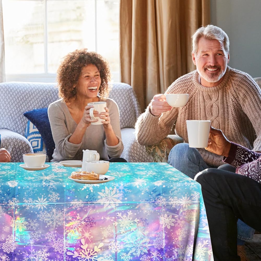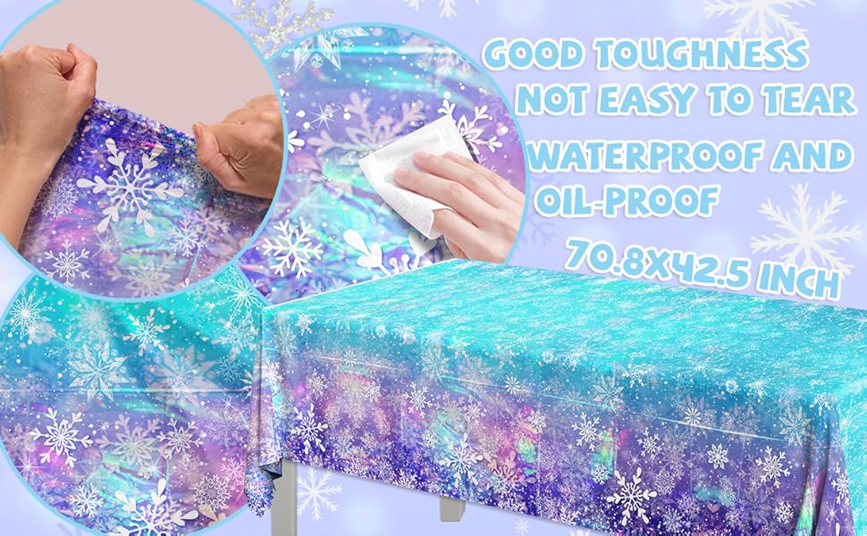 HIGH QUALITY winter SNOWFLAKE TABLCLOTH: The iridescent snowflake tablecloth are made of high-quality plastic materials, which are durable, sturdy, non fading, waterproof and splash proof, not easy to tear or break, preventing your table from getting dirty and scratched, providing you with a good user experience