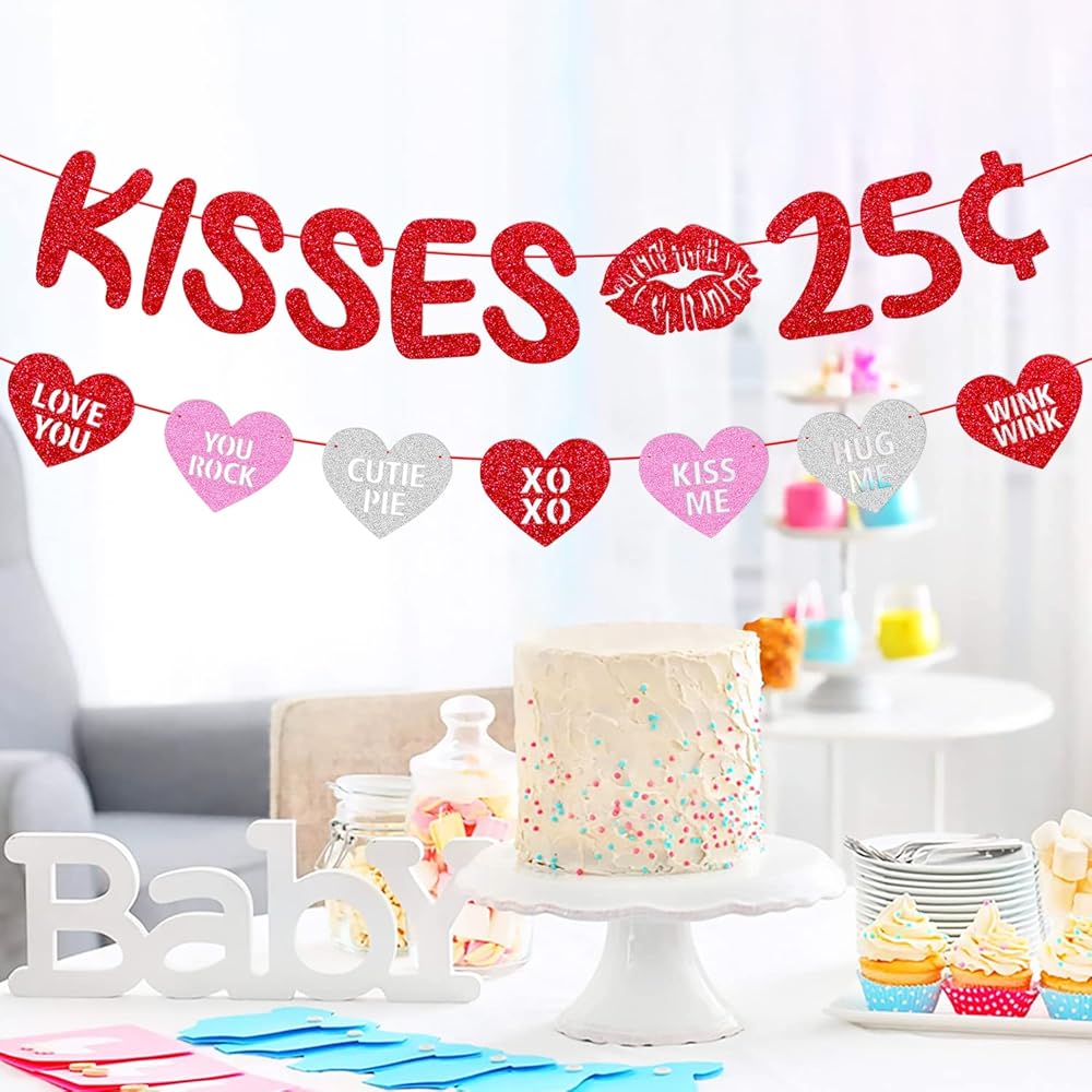 Pre-Assembled: This Valentine's Day Kisses 25 Cent party decoration will comes pre-strung with adjustable long rope, the interval space of these banner can be adjusted as you like. Transform any room or venue into a celebration of love with this romantic valentine's banner, is the perfect touch for your Valentine's setup.