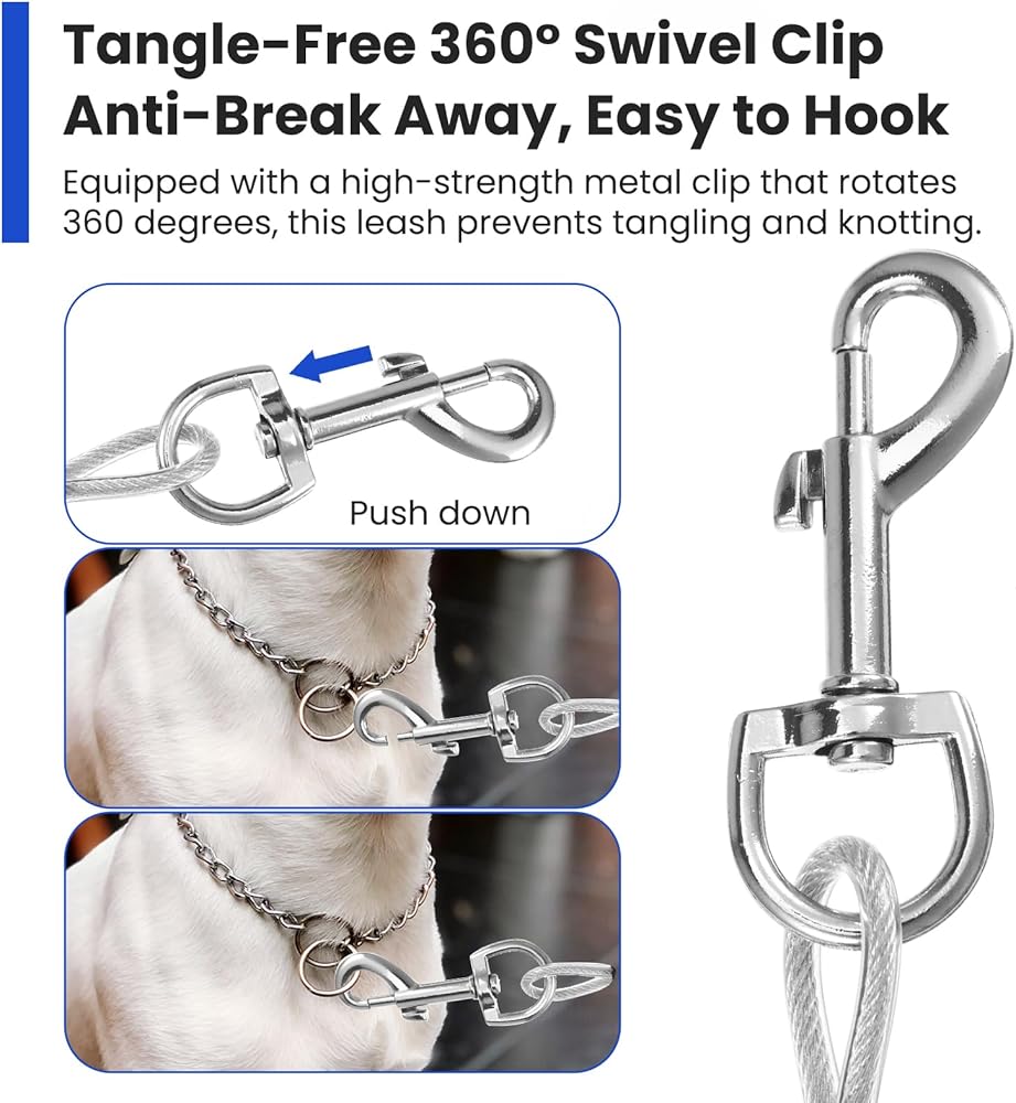 The combination of a chew-proof stainless steel core and a reliable swivel clip creates a leash designed for maximum safety and longevity. It's the ultimate solution for preventing escape attempts and destructive chewing, saving you money on replacements.
