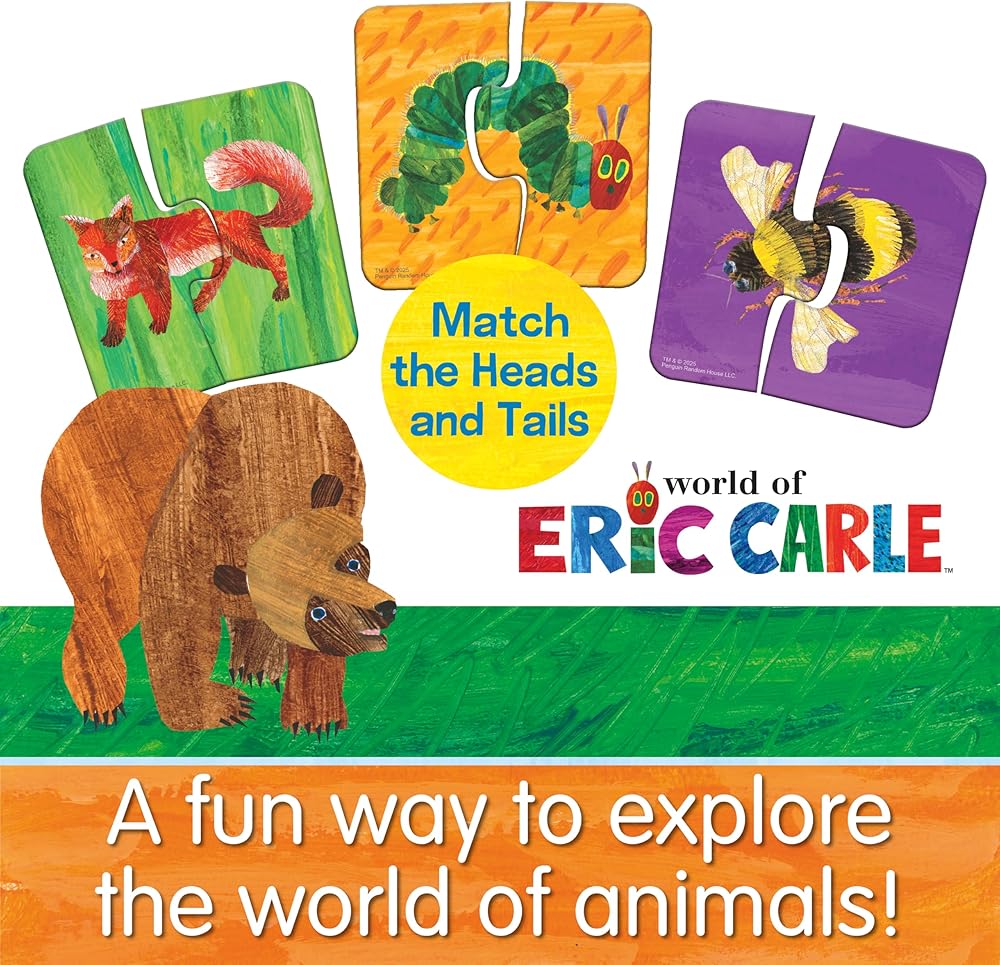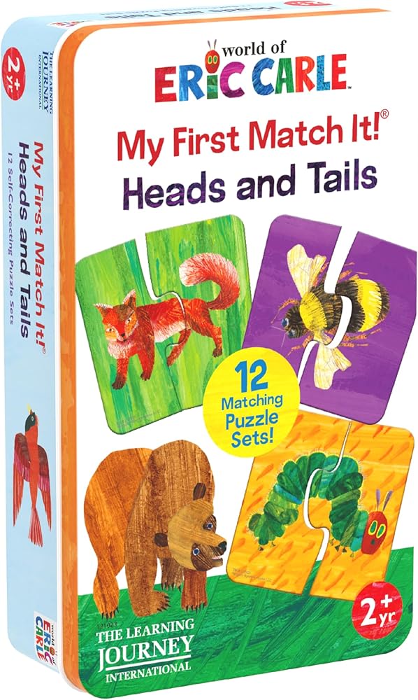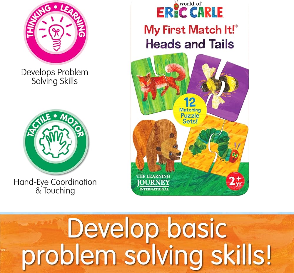 Matching is an important pre-reading skill that children need to develop in order to help them get ready for school. The World of Eric Carle My First Match It! Head & Tails is the perfect tool to help your little ones practice this essential skill. This set contains two-piece self-correcting puzzle cards that introduce favorite Eric Carle characters. The fun, brightly illustrated cards are designed for a younger child and engage them in the learning process in an entertaining way. The World of Eric Carle My First Match It!- Head & Tails includes 12 self- correcting puzzle pairs. Ages 2+ years