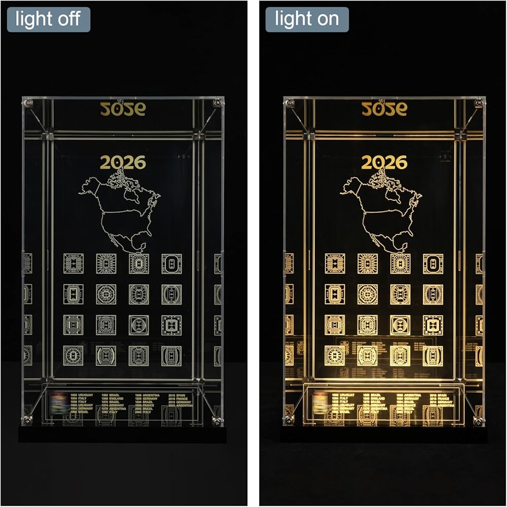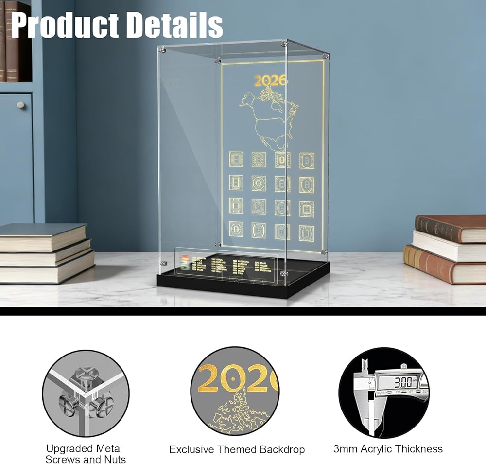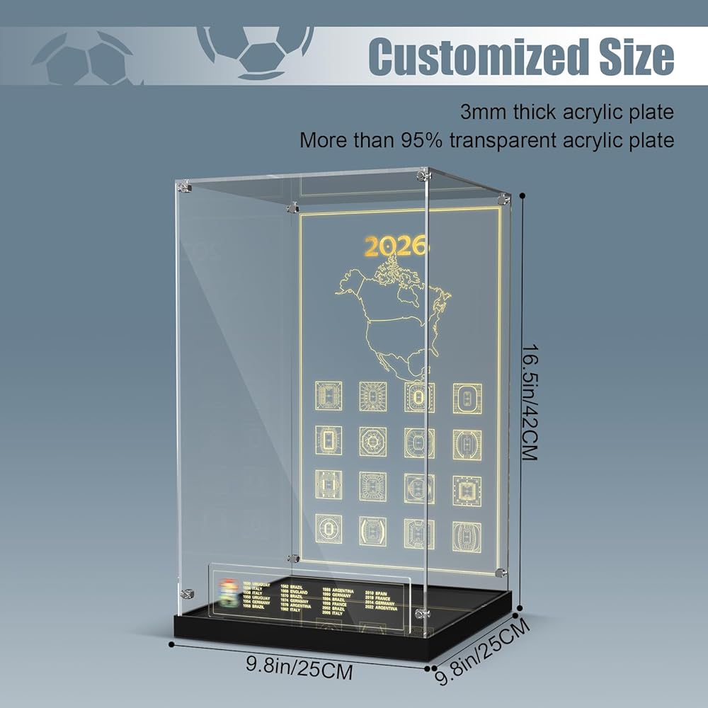 Showcase your Lego 43020 FIFA World Cup Official Trophy in style with this high-quality acrylic display case. Designed specifically for the set, this clear case offers complete dust protection and crystal-clear visibility from all angles. The built-in one-touch LED lighting system instantly bathes the golden trophy in bright, eye-catching light—no complicated settings or dimming needed. Featuring a robust metal screw structure, the case is assembled for superior stability and durability. Easy to set up and designed to impress, it's the perfect way to preserve and highlight your Lego World Cup masterpiece. Ideal for collectors, fans, and as a standout gift!