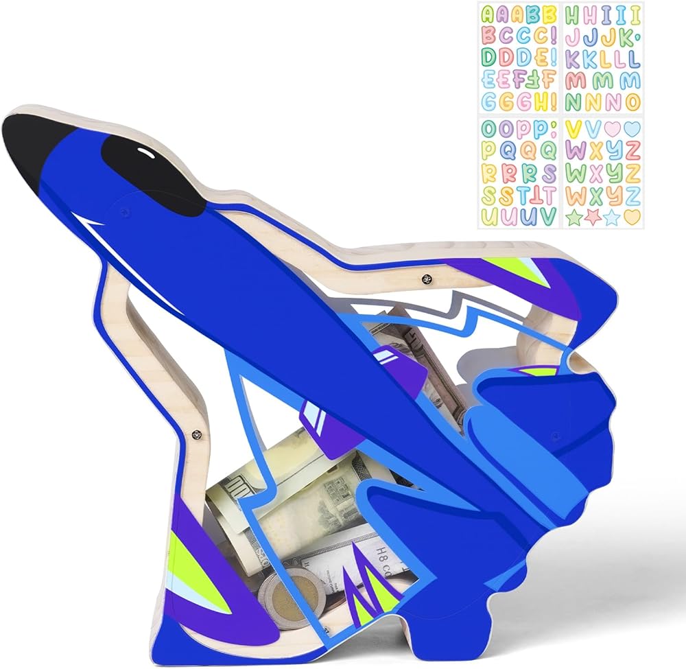 Super Fun Airplane Design - This wooden piggy bank looks just like a bright, colorful cartoon airplane—with those eye - catching red, blue, and yellow accents, a clear acrylic section that lets you peek at the “cabin” inside, and a cool wood - textured body that both kids and airplane lovers will absolutely adore. Whether you're stashing coins for your next adventure or adding a totally rad aviation - themed decor piece to a bedroom or desk, this airplane bank makes feel like a awesome journey.