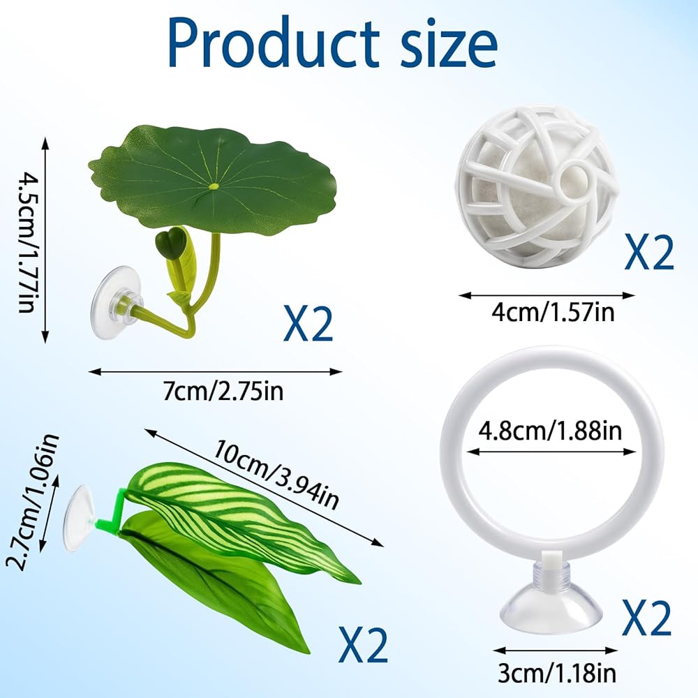 This 8-piece betta fish toys set is designed to provide enrichment and stimulation for your aquatic pets. The set includes 4 leaves, 2 rings, and 2 balls, all crafted from durable material to withstand water conditions. Perfect for betta fish hammock and fish tank toy use, these accessories add variety and interest to your fish tank while encouraging natural behaviors in your betta fish. The durable material ensures long-lasting use, resistant to wear and tear, and safe for your aquatic pets. Easy to clean and maintain, these toys are suitable for both small and large tanks and can be used with other fish tank accessories. Simply place them in your tank for instant enrichment. Stimulate your betta fish with this versatile set, providing mental and physical stimulation to help reduce stress. Ideal for solitary fish, these toys can be part of a regular enrichment routine, making them a valuable addition to any aquatic environment.