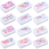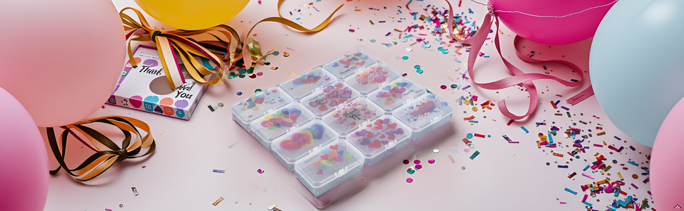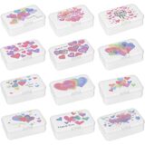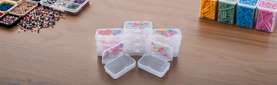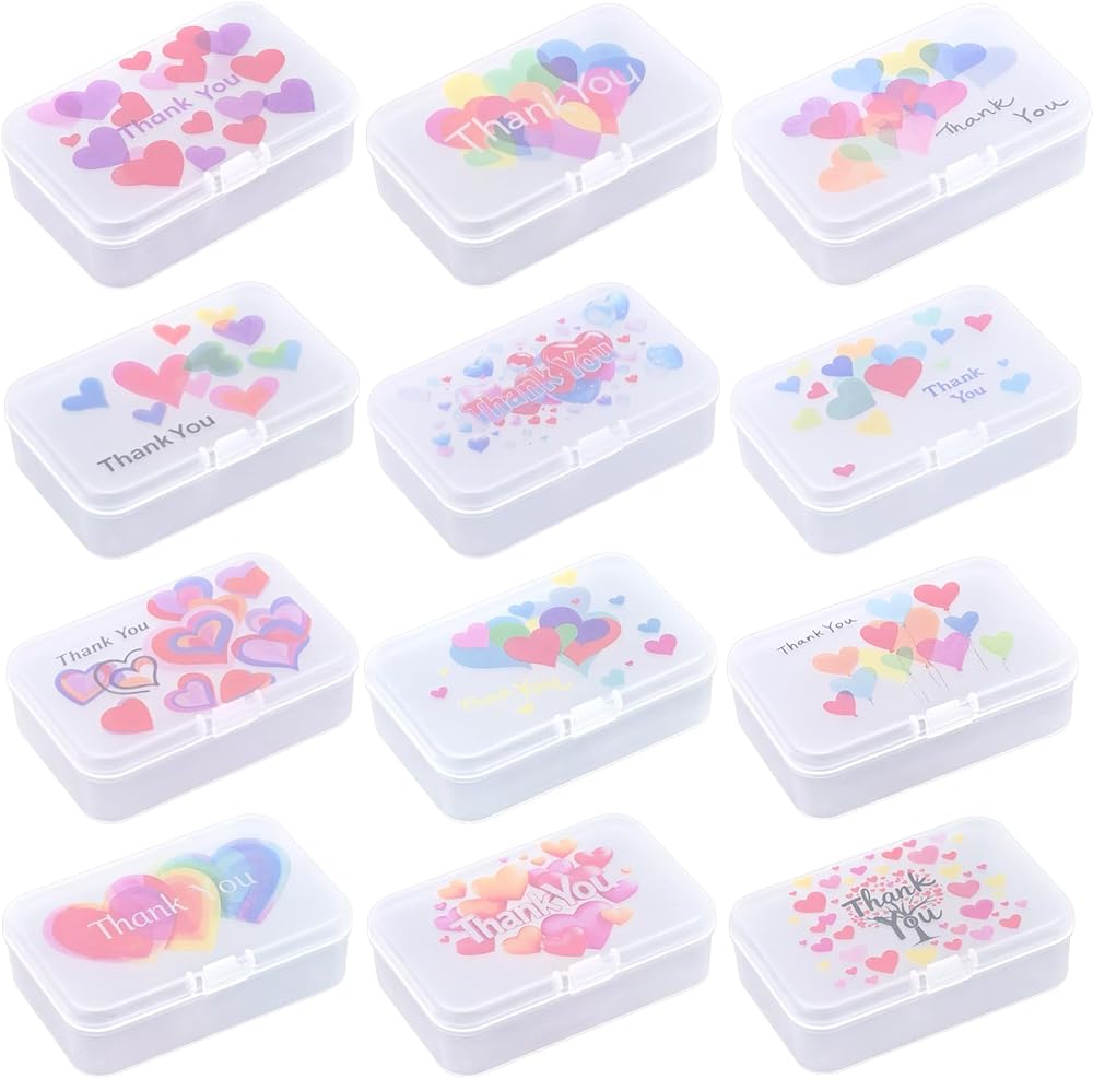 Contains a total of 12pcs empty rectangular plastic boxes with hinged lids, each box with custom designed Thank You image pattern printed on the lid.