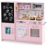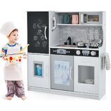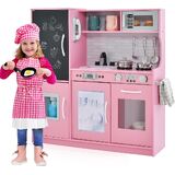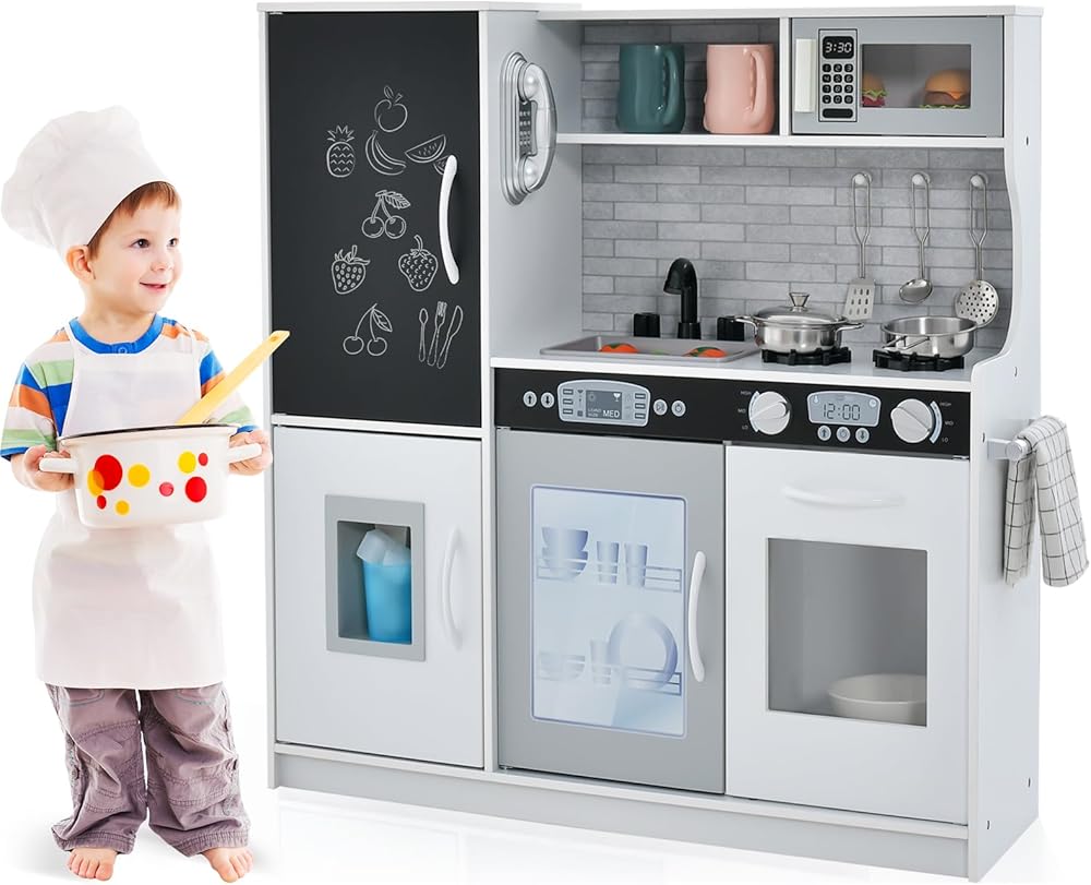 Let kids experience the actual kitchen scene with OLAKIDS kitchen playset. It has realistic simulated stove with sound, refrigerator with blackboard, ice maker, telephone, oven, microwave, sink, faucet and other interesting accessories for extra fun. High-grade MDF and PP materials are lightweight but extra sturdy, so the kitchen stands up to heavy use at home or school setting. By this role-playing game set, children enable to acquire social skill, exercise hand-eye coordination, and promote creativity and imagination. In addition, the kitchen play toy can also encourage parent-child interaction. With step-by-step instructions and high-quality hardware included, assembly is refreshingly easy. Creating hours of fun playtime, this toddler play kitchen set is the perfect gift for kitchen themed party, holiday toy gifts, birthdays gifts and more!