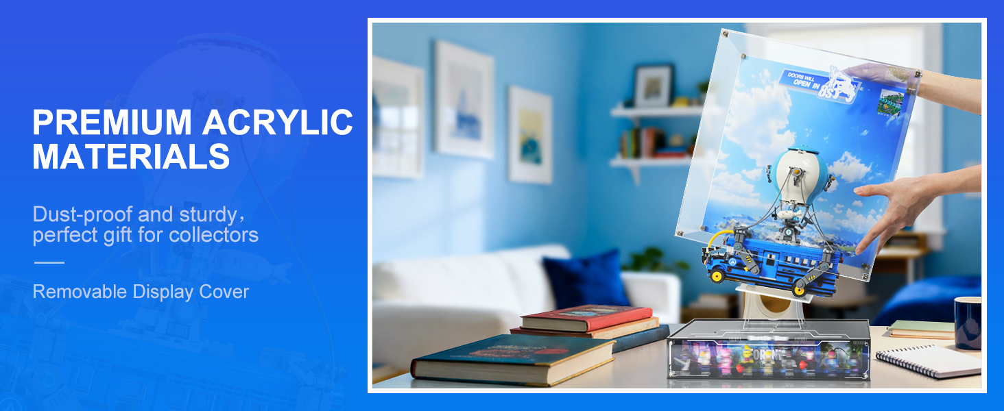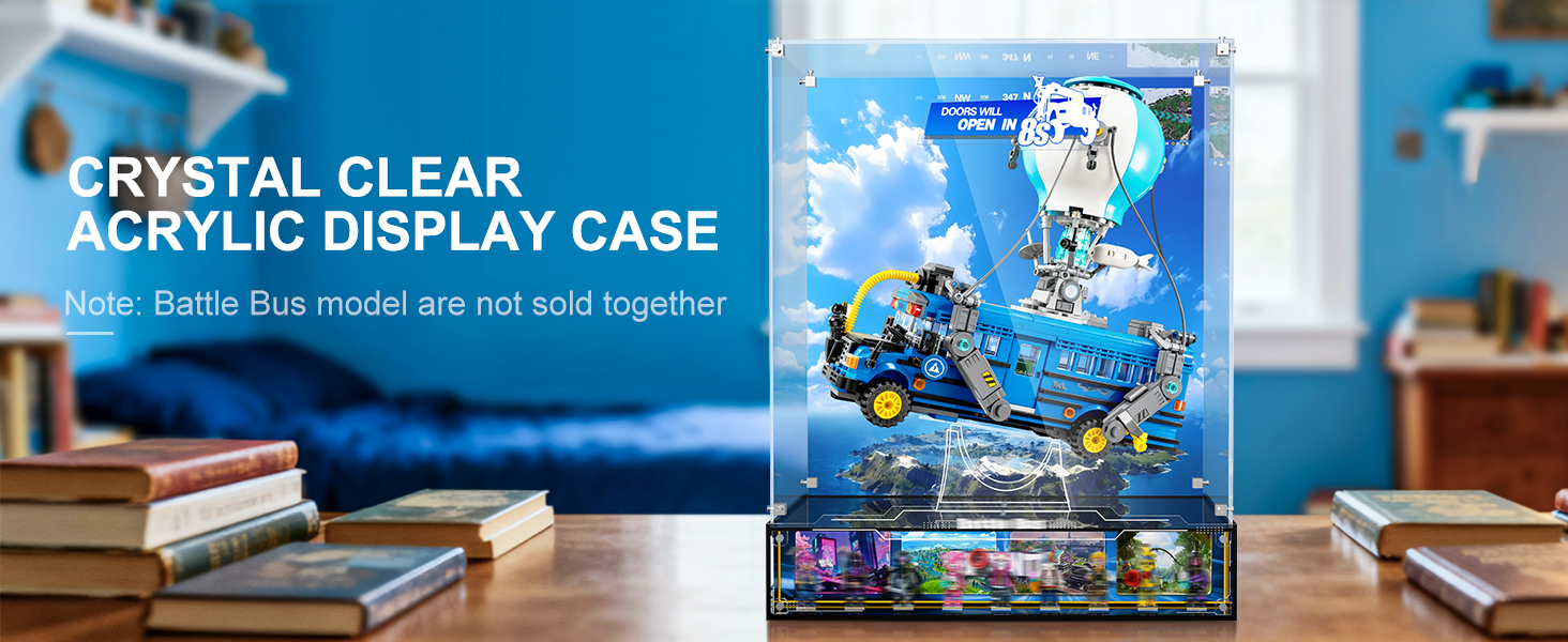 Acrylic Display Case Compatible with Lego 77073 Battle Bus - Fortnite Inspired Acrylic Showcase with Floating Stand, Magnetic Door, Printed Background & Minifigure Base - Dustproof, UV Protection