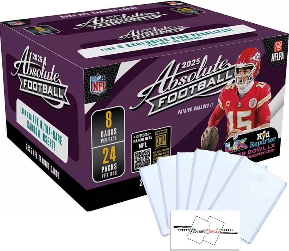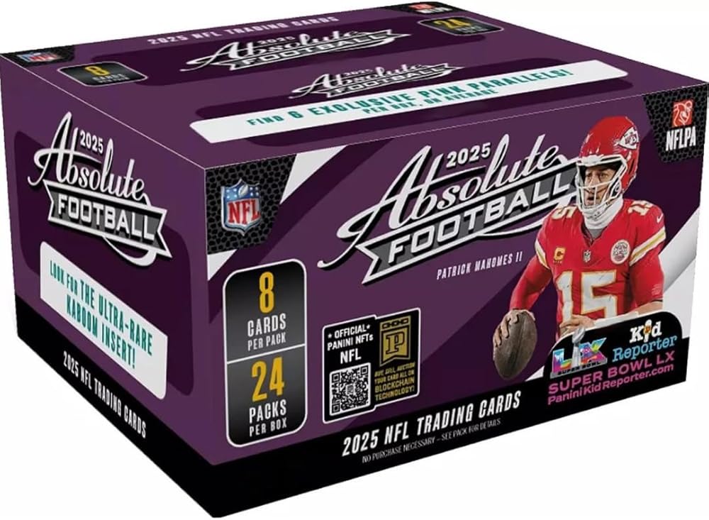 2025 Absolute Football NFL Retail Box with 192 Trading Cards + 6 Toploaders + StreetCards Magnet! Look For The ULTRA-RARE KABOOM Insert! Look By Storm, Draft Diamonds, Hog Heaven, Rookie Wave and The KABOOM Horiziontal! Look For Rookies Pink, Rookies Red Squares and Signature Rookies Pink! Each box contains: 8 Cards Per Pack, 24 Packs Per Box – For A Total of 192 Absolute Trading Cards! Includes 6 Toploaders! Includes StreetCards Magnet!