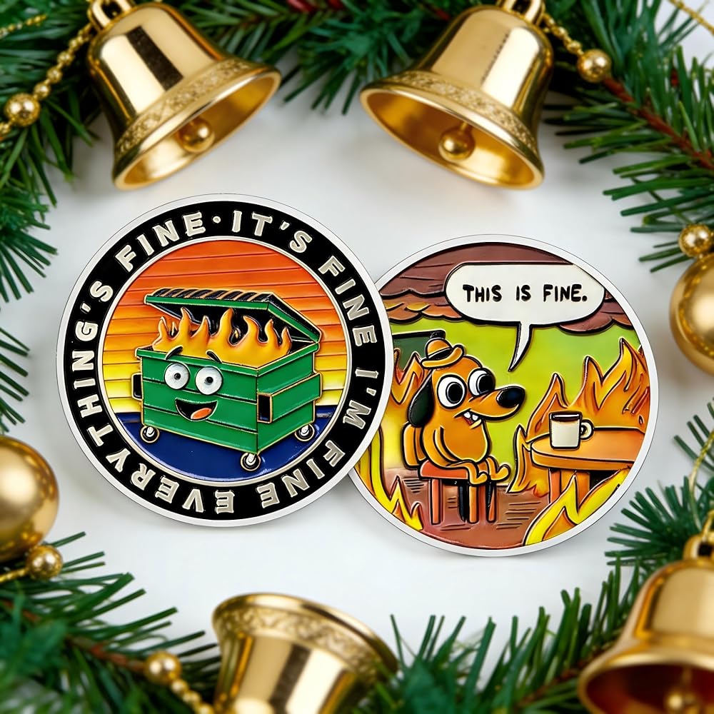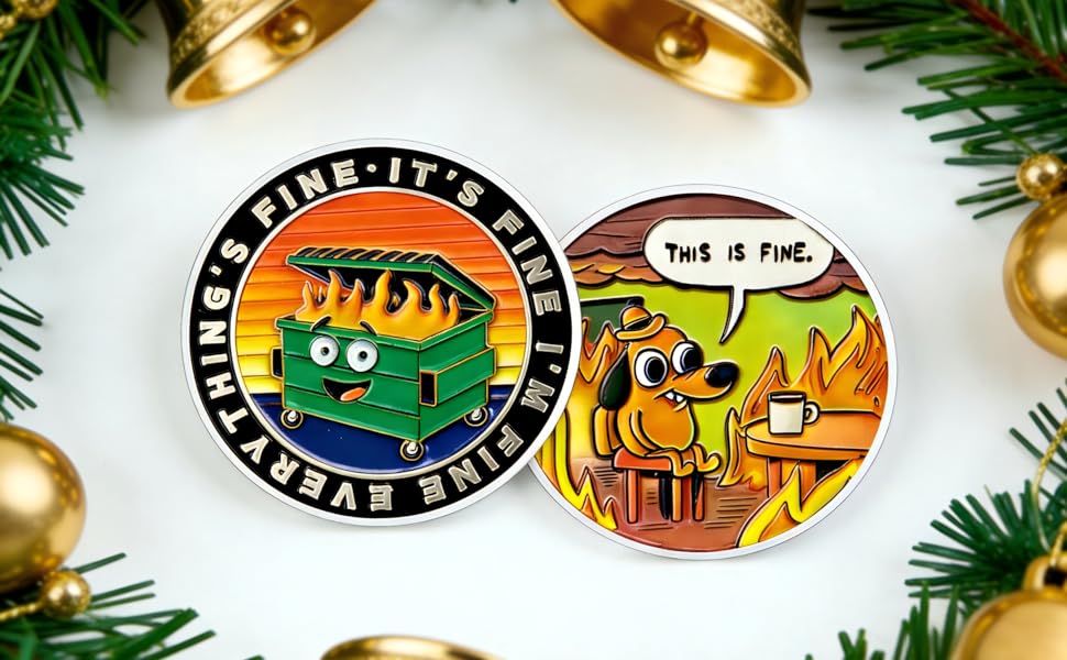 • Embrace Chaos with Humor: When life feels like a dumpster fire, laugh it off! This quirky coin features a flaming green trash can with the words "Everything's Fine—It's Fine—I'm Fine," celebrating resilience with a wink.