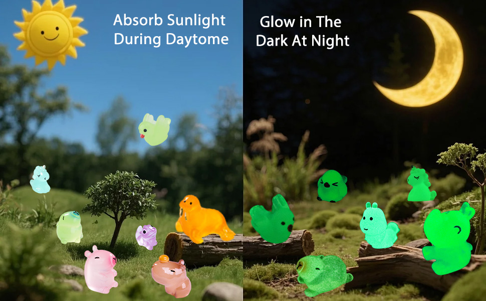 Magical Glow-in-the-Dark Surprise:These tiny animal figurines need to absorb sunlight, and the stronger the UV rays, the brighter they glow in the dark;they add a charming touch of light and whimsy to any small-scale creation