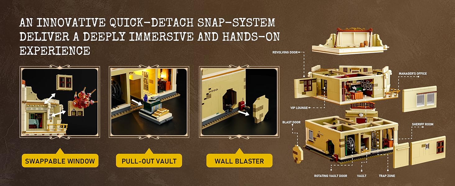 An Interactive Battlefield: Become the director of an epic showdown! This set is engineered for action, featuring a press-to-blow wall breach for accessing the vault and a clever trapdoor that sends a bandit tumbling between floors. With easy-open walls for full access, you can stage every shot of the intense shootout between bandits, guards, and the bank manager.