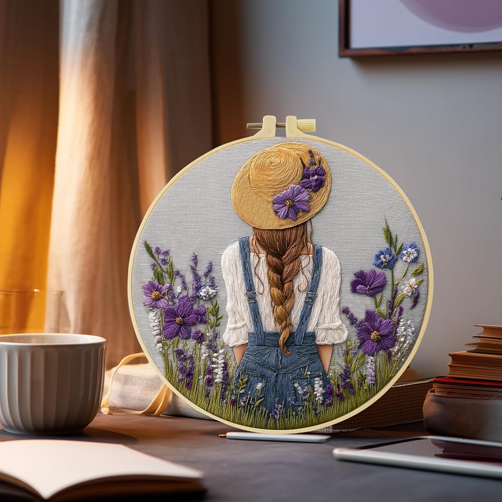 Girl’s back in a straw hat with purple flowers Patterns Embroidery Kits for Beginners,Adults Starter Cross Stitch Kit ,DIY Needlepoint Everything is Fine,Step by Step Instructions and Video Tutorial
