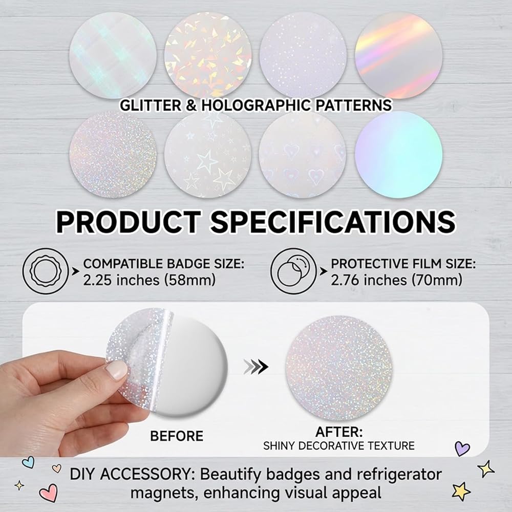 180 Pcs Badge Protective Film 70 mm/2.76 in, 9 Styles Button Maker Supplies Holographic Glitter Film for 2.25 In/58 mm Button Maker, Round Badge Buttons Making Parts for DIY Pinback Buttons Crafts