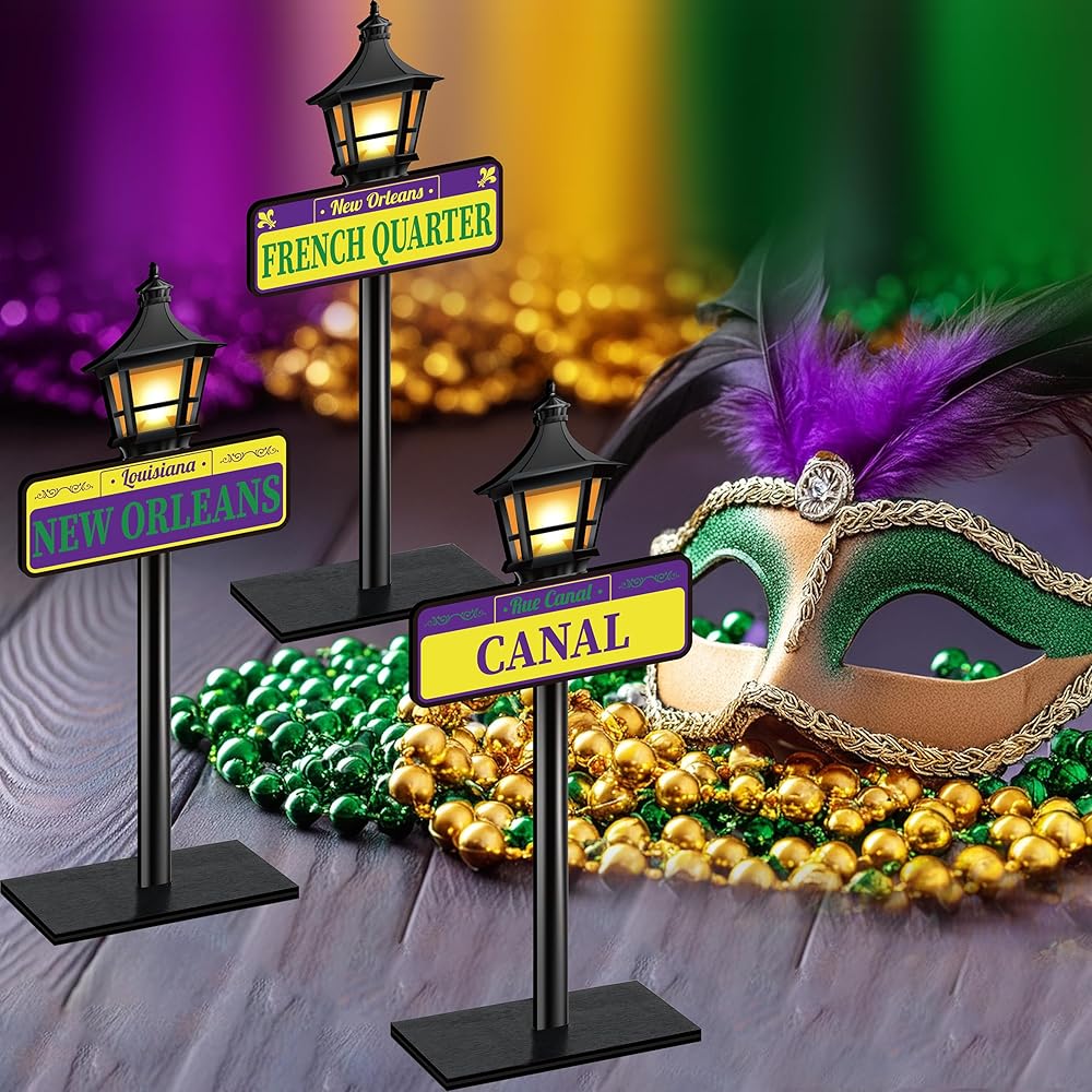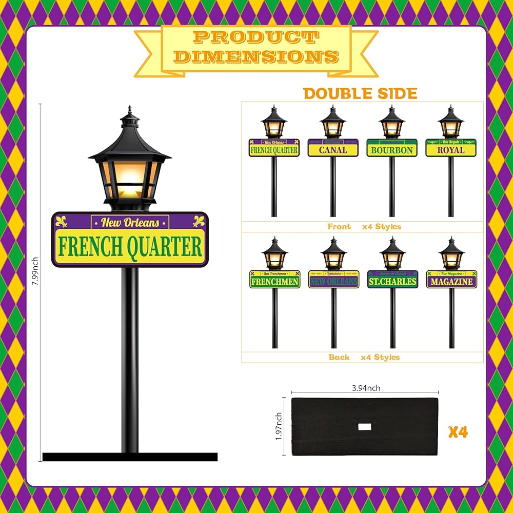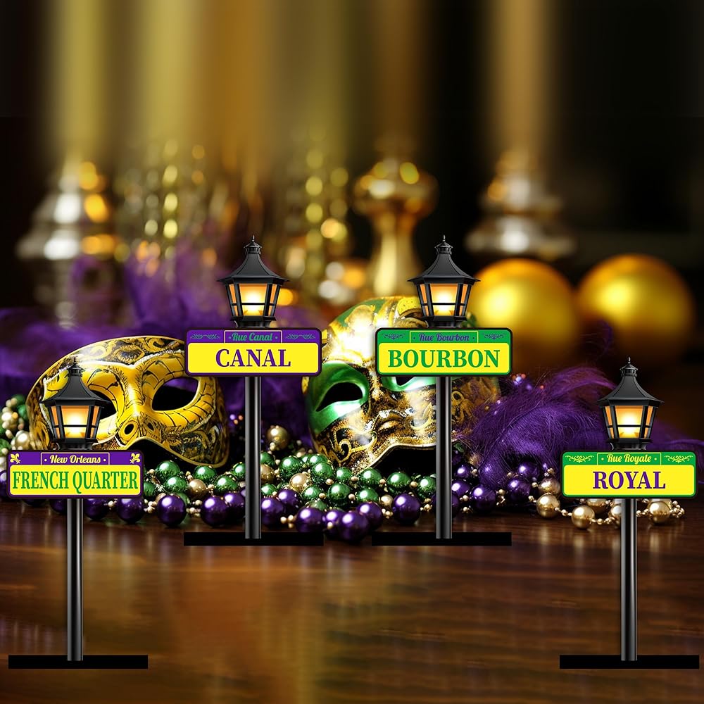 PACKAGE INCLUDES: 4pcs Mardi Gras-style street signs, each crafted on a rustic wooden base and double-sided with different New Orleans street names—such as New Orleans City, French Quarter, Canal, Bourbon, Royal, St. Charles, Frenchmen, and Magazine Street—so every piece truly captures the vibrant soul of the city.