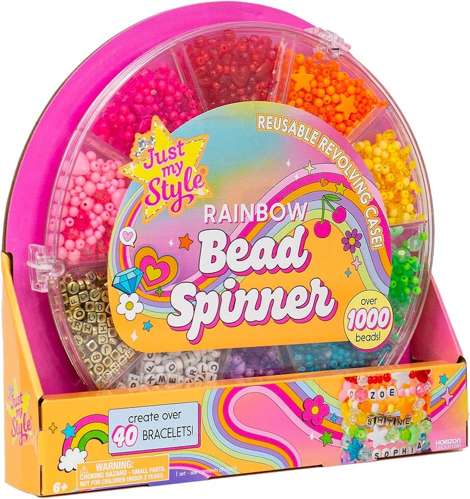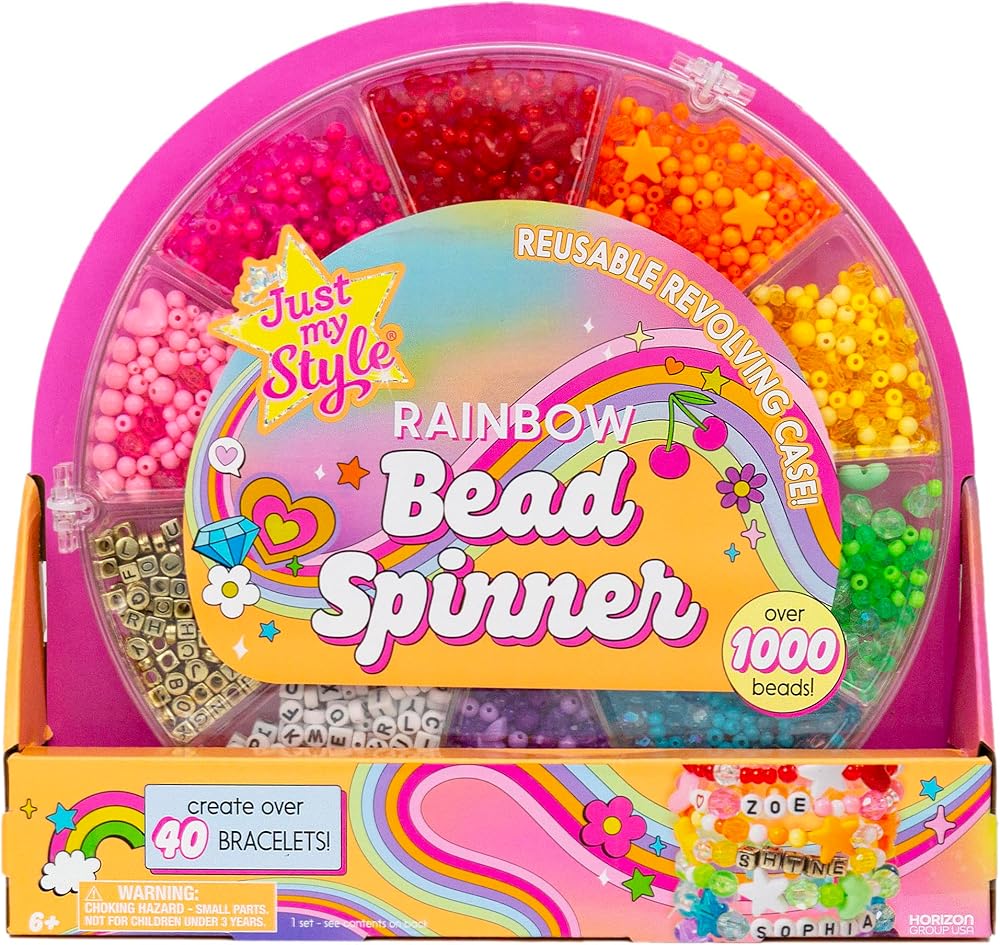 Get ready to bead your heart out with the Just My Style Rainbow Bead Spinner! This isn't just any bead kit — it's a bracelet-making party waiting to happen. Complete with over 1,000 beads and 30 feet of cording, you can create stacks and stacks of over 40 bracelets. The reusable revolving case makes beading a breeze — whether you're crafting solo or with friends, it's easy to grab your favorite beads without the mess (or the stress!) of loose bags. Personalize your pieces with letter beads, faceted hearts, stars, butterflies, and a full rainbow of translucent and opaque designs — plus, the bonus sticker sheets let you decorate the case or any of your fave accessories. When you're done, snap the case shut for quick, easy storage and on-the-go fun! Get ready to spin, stack, and shine — this kit is perfect for any bracelet lover age 6 and older.
