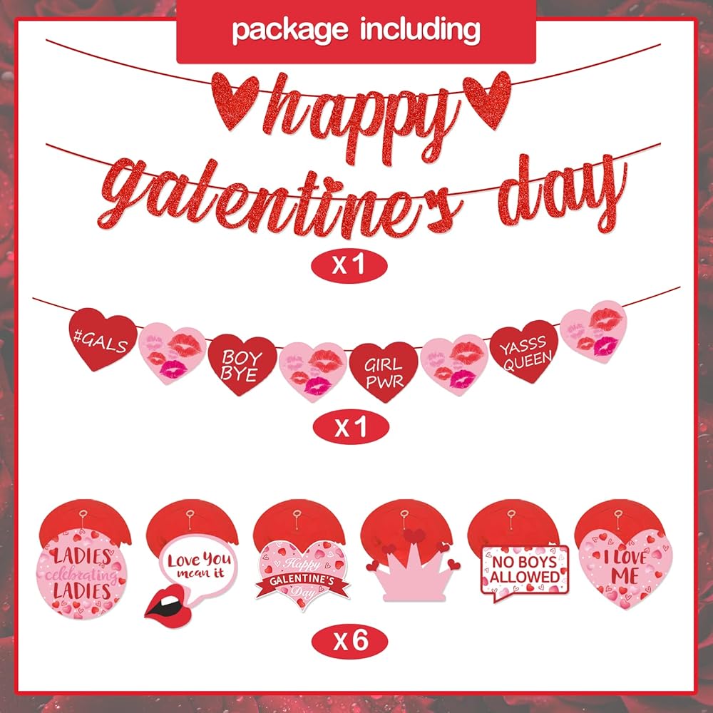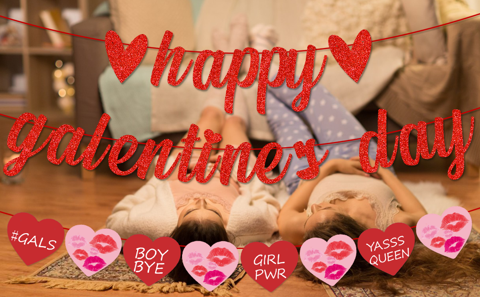 Happy Galentine’s Day Banner for Ladies Girls Galentine’s Day Celebration Party Decorations Glitter Red Pink Heart Romantic Engagement Wedding Proposal Party Supplies
