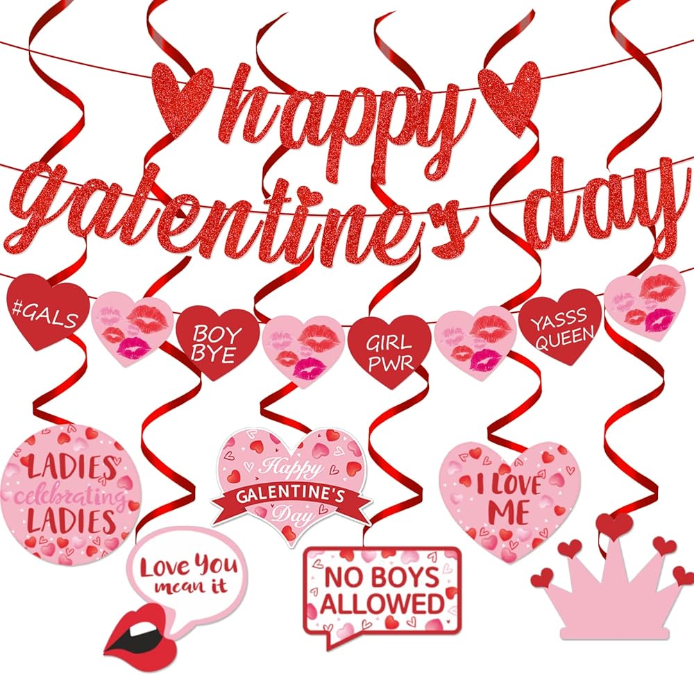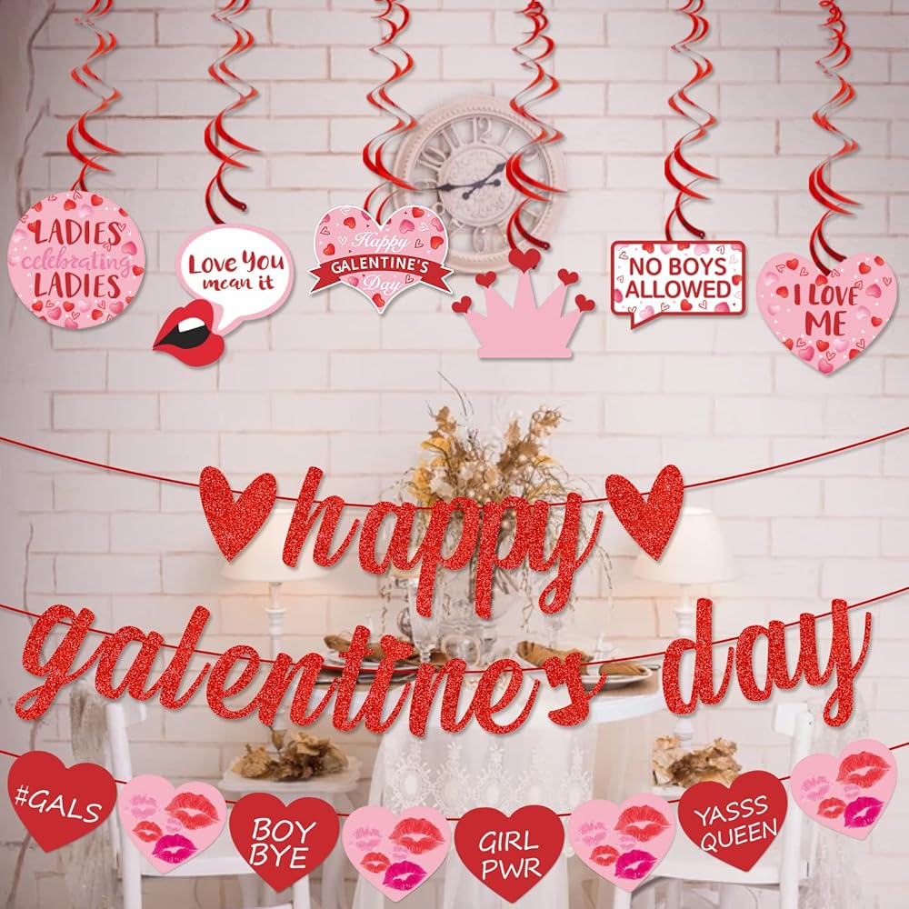 Galentine's Day theme: This banner and hanging swirl set is perfect for adding a touch of Galentine's Day cheer to your home or event. The banner features a "Happy Galentines Day" message surrounded by love-themed imagery and glitter, while the garlands banner and hanging swirls feature playful and whimsical Galentine's Day designs.