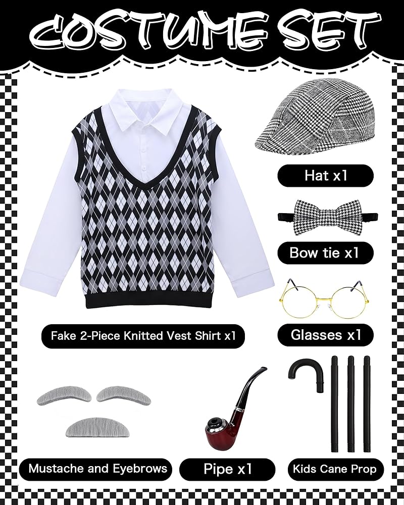 Classic Style: The black checkered pattern and vintage accessories bring timeless gentleman charm. Suitable for creating a playful “grandpa” character that kids will love showing off at school or costume parties