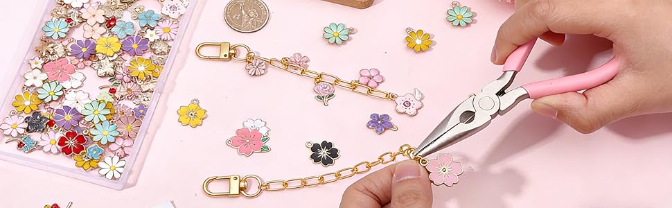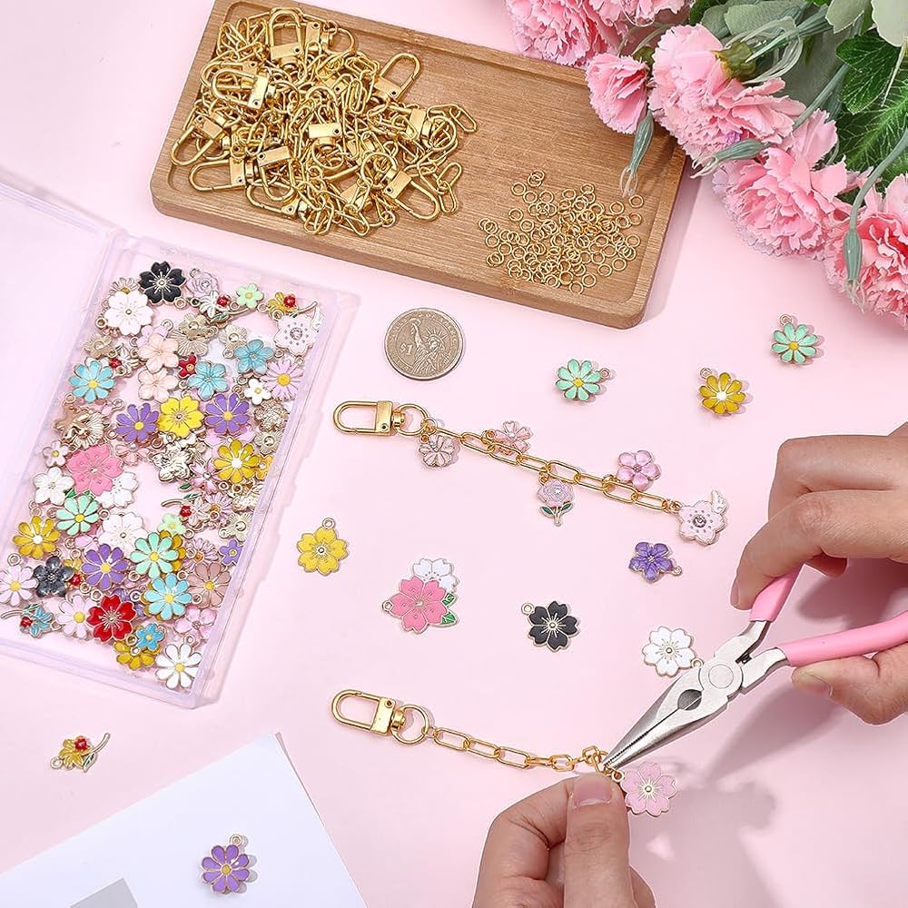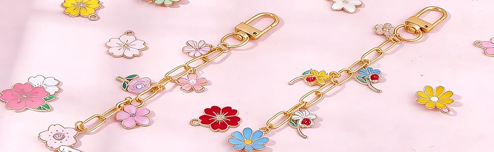 100Pcs Flower Keychain Charms: There are various styles of flower enamel charms, abundant in quantity and bright colors. You can choose your favorite flowers to make unique keychains, which are very suitable for DIY production