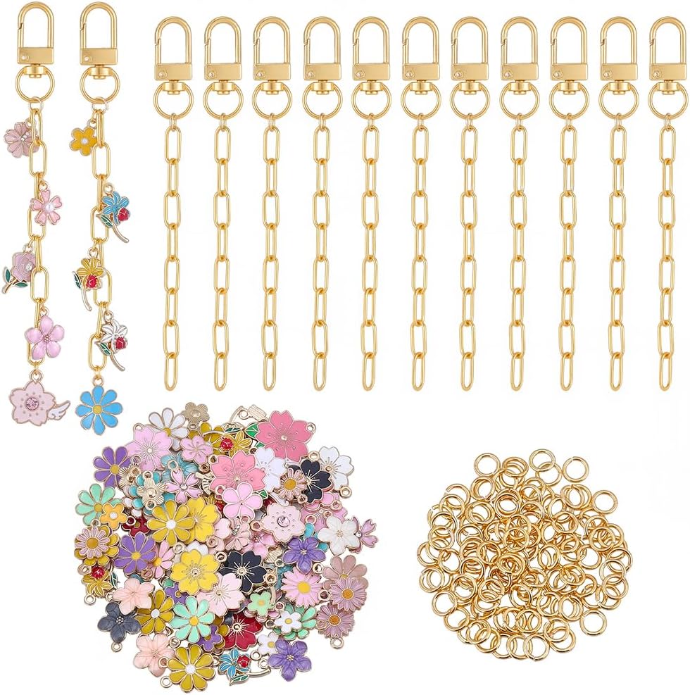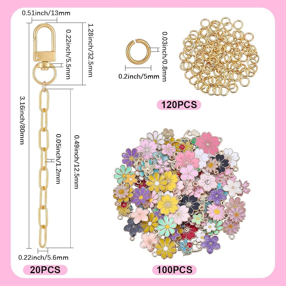 240Pcs Keychain Making Kit: Package includes 20pcs keychain clasps, 100pcs flower enamel charms, and 120pcs jump rings, which do not require additional purchase. The quantity is abundant and meets daily DIY production and replacement needs