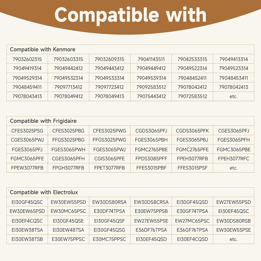 Compatible with】: Compatible with Kenmore Frigidaire Electrolux including 79032602315 79032603315 79032609315 79041143511 79042533315 79049413314 79049419314 CFES3025PWG CGDS3065PFJ CGDS3065PFK CGES3065PFJ CGES3065PWJ FFGS3025PBG FFGS3025PWG FGES3065PBH FGES3065PBJ FGES3065PFJ FGES3065PWJ FGMC2765PBE FGMC3065PBE EI30GF45QSC EW30DS80RSA EI30GF45QSD EW27EW55PSD E30EW75PPSB EI30EF45QSC EI30EF4CQSC EI30GF45QSE EI30GF45QSF etc. Use CTRL+F to search your model for fit confirmation