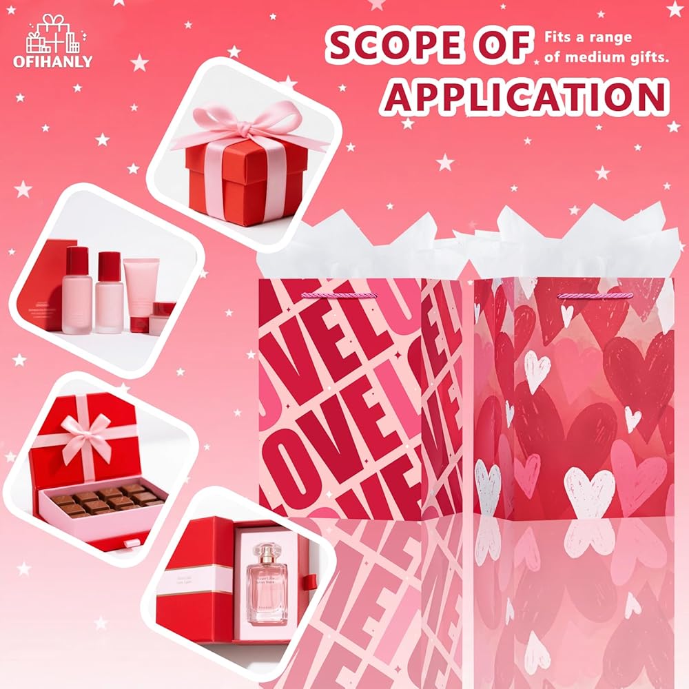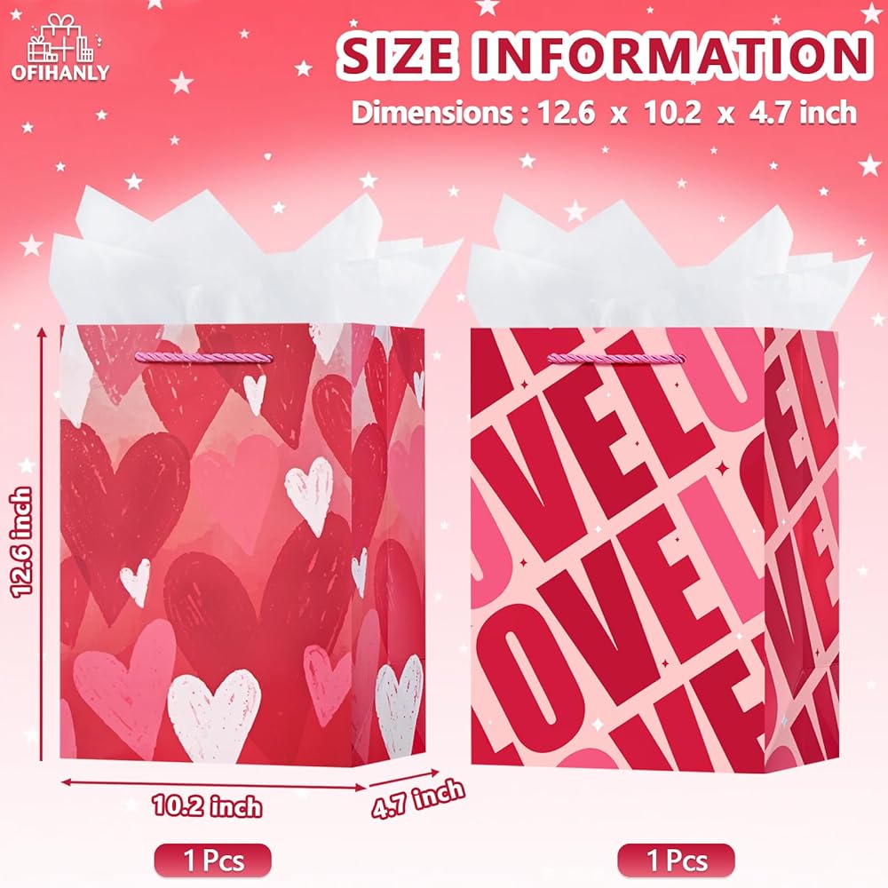 OFIHANLY 2 Pack 12.6" Medium Size Happy Valentine's Day Gift Bags with Handles for Women Her Pink Love&Heart Heart Paper Gift Wrap Bags with Tissue Paper for Kids
