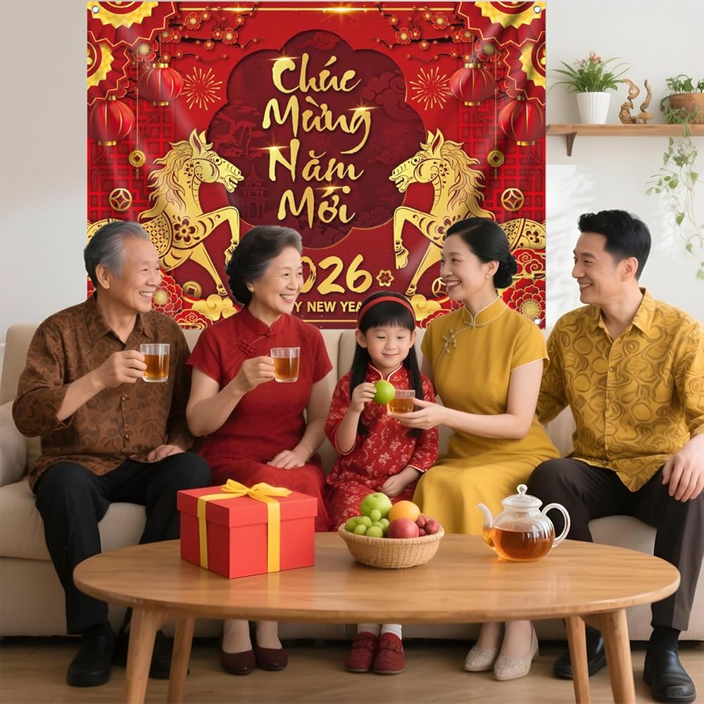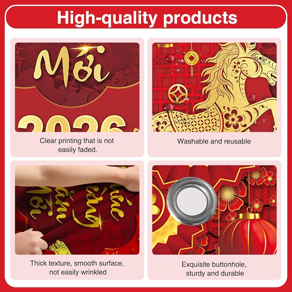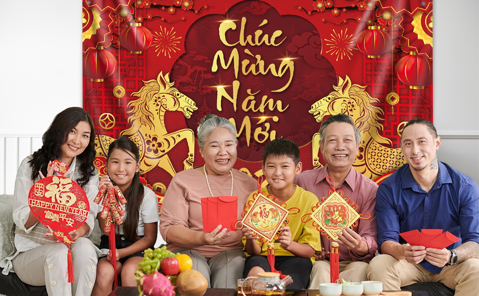 Good Choice for Vietnamese New Year decorations: Our Vietnamese New Year backdrop features classic elements, such as horses and lanterns, to create a festive atmosphere. Make your 2026 Lunar New Year decorations special with our Chuc Mung Nam Moi backdrop.