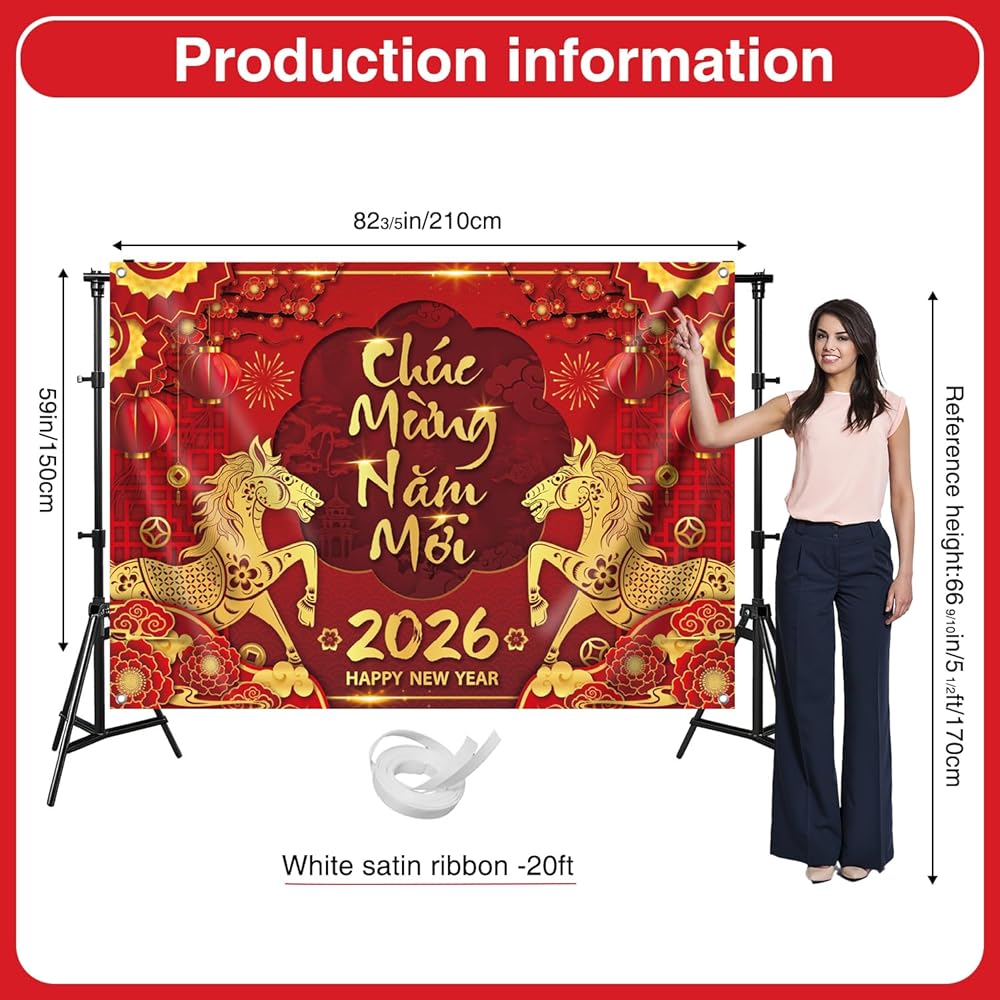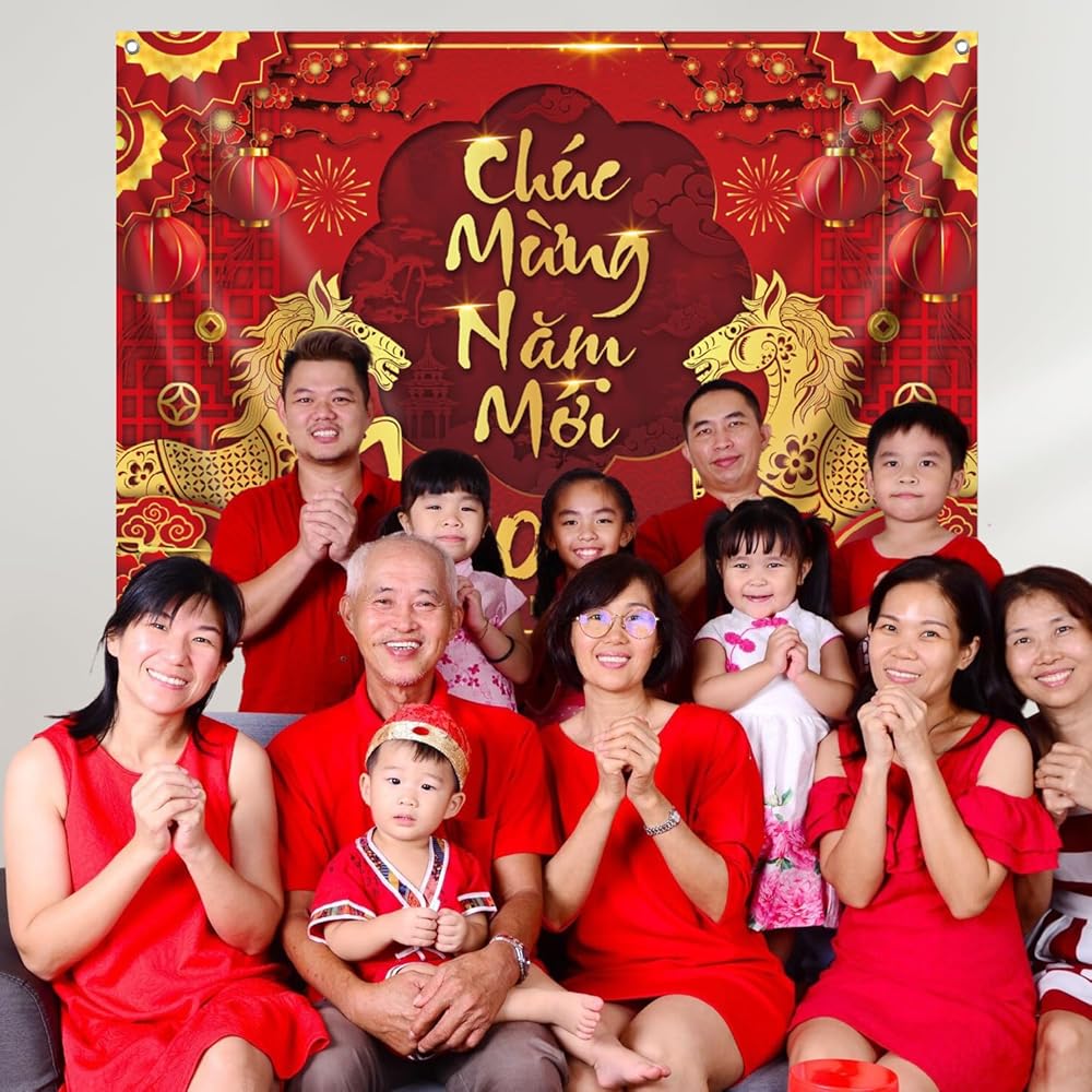 Package includes: The Vietnamese Lunar New Year decorations banner includes 1pc Chuc Mung Nam Moi decorations backdrop and 19.6ft rope. The banner is 7 x 5 ft (83" x 60" / 210 cm x 150 cm) and its large letters make it easy to see from a distance, attracting the attention of guests. This is a very suitable choice for tet decorations vietnamese 2026