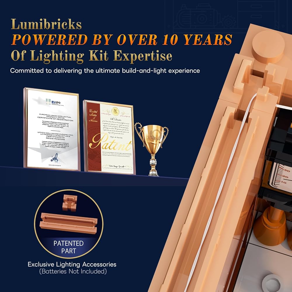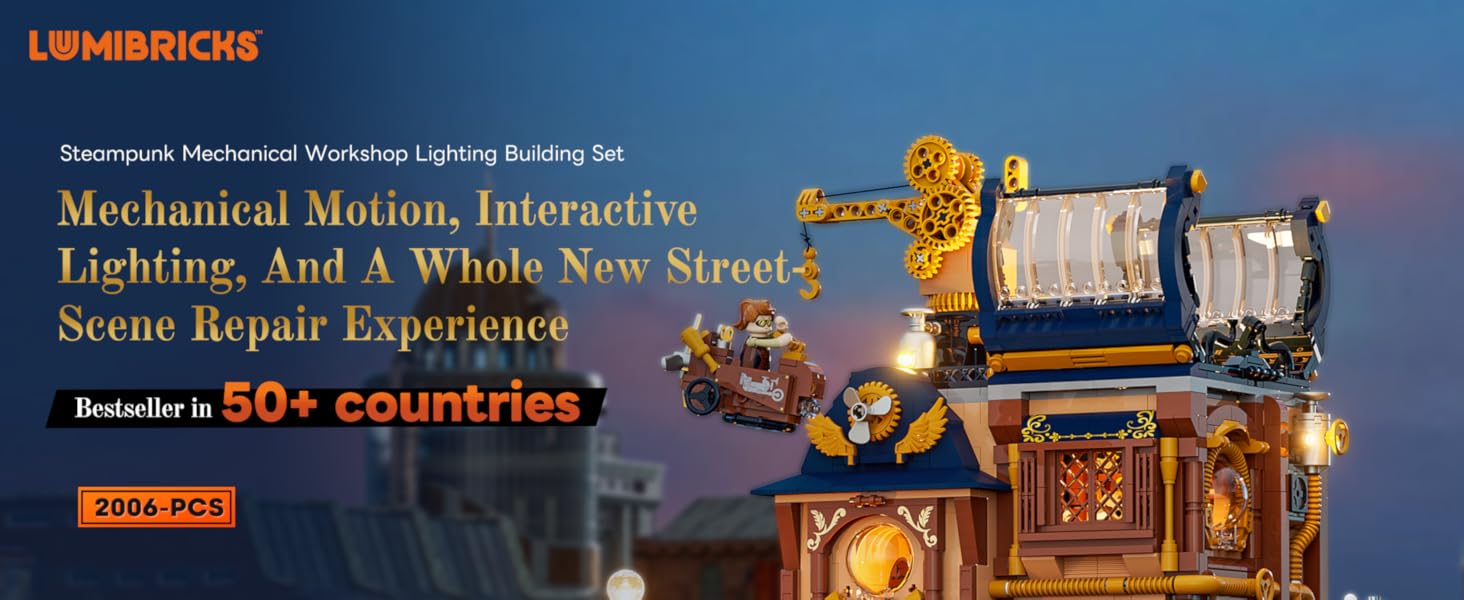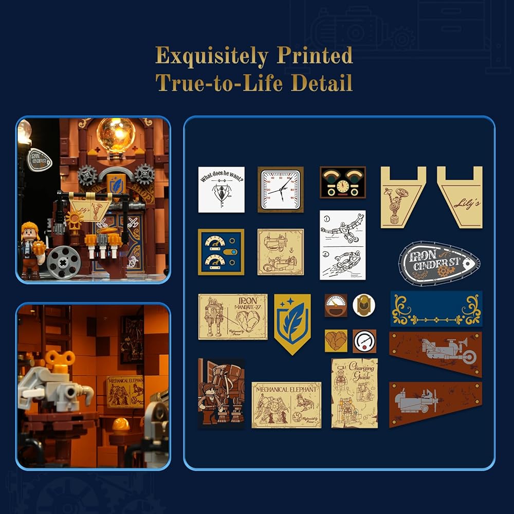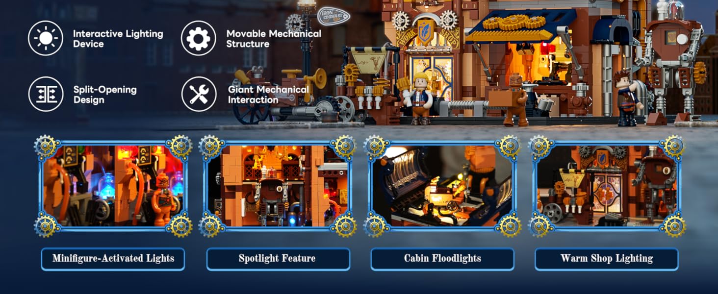 INTERACTIVE LIGHT & LIFE - Powered by an innovative interactive lighting system that brings your build to life. Place a minifigure on the platform to magically switch on the workshop lights, creating a hands-on repair scene. Combined with the robot repair spotlight, warm shopfront glow, and aircraft runway lights, it crafts a deeply immersive day-to-night steampunk streetscape.