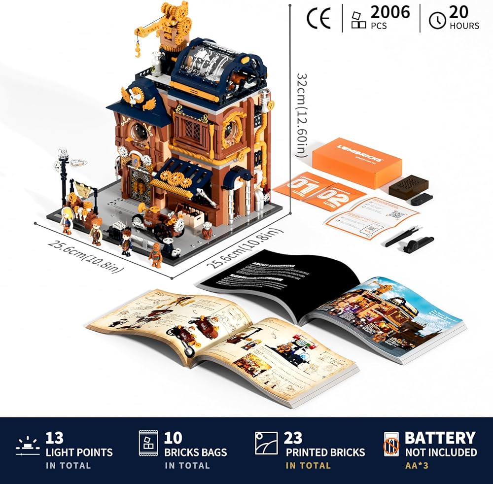 Steampunk Mechanical Workshop Lighting Building-Bricks Set, 2006 Pcs The Sky-Lane Repair Shop Modular Building from Aeronauts Collection Display Set for Adults and Steampunk Lovers