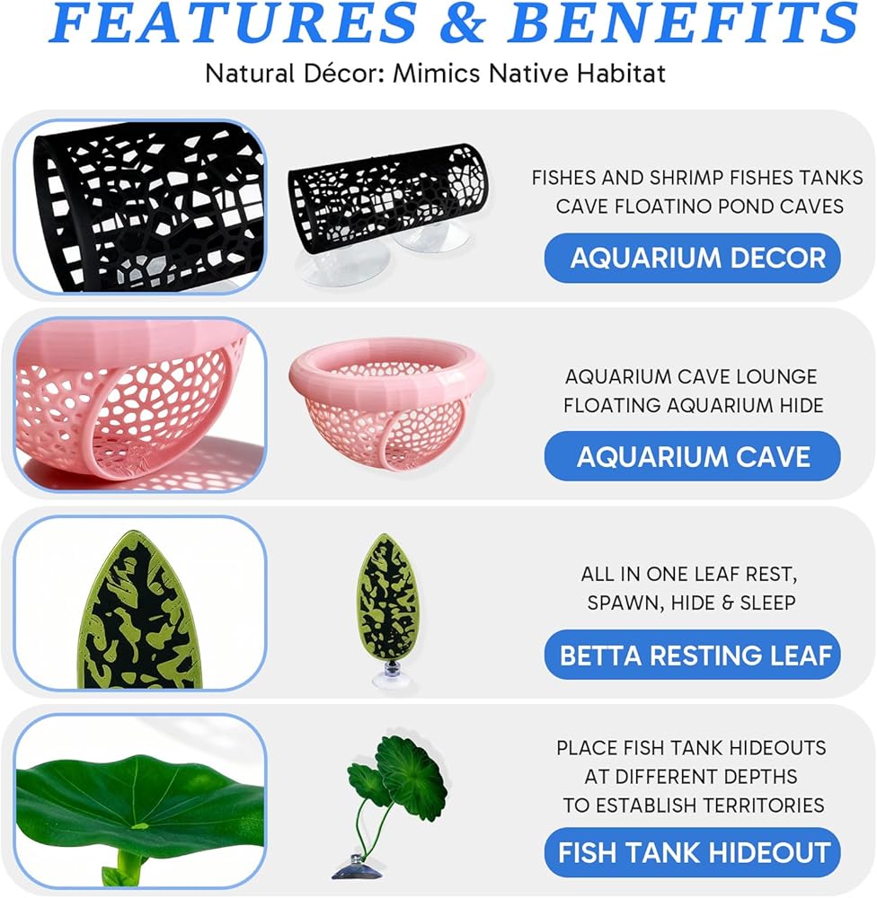 Durable Aquarium Decor Materials: Crafted with sturdy and long-lasting materials, these betta decor pieces ensure safety and comfort for your betta fish; Smooth surfaces of the betta fish hideout and enriched betta enrichment toys prevent damage to delicate fins while maintaining visual appeal
