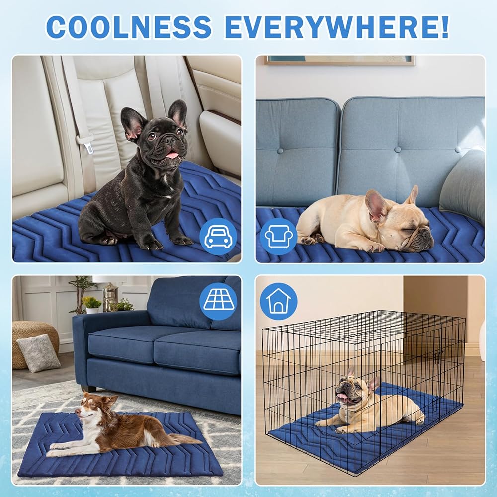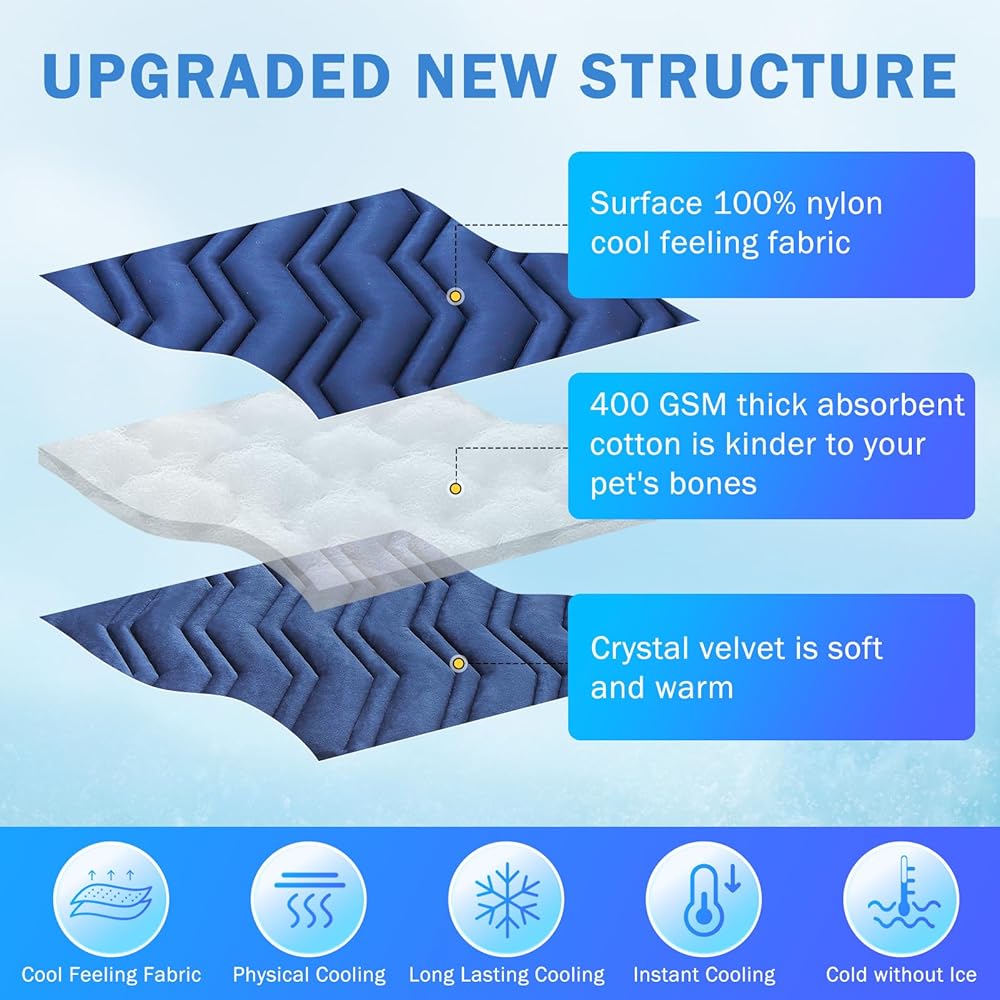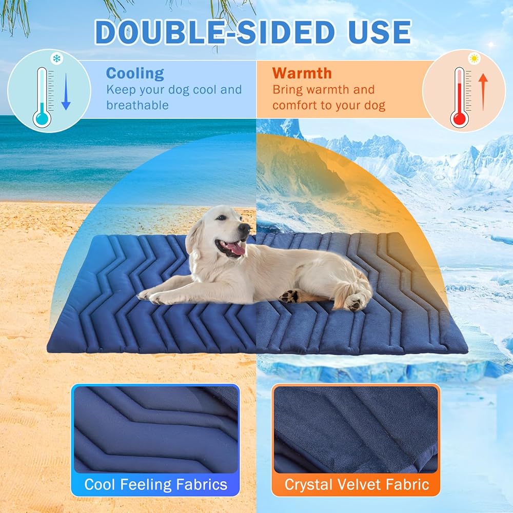 2025 UPGRADED PET COOL SENSE MAT FOR YEAR-ROUND COMFORT: Our upgraded cool mat has a double sided design with 100% nylon cool sense fabric on the surface, 400 gsm cotton center fill, and soft, breathable crystal fleece fabric on the back. In summer it is a cooler mat, in other seasons it is a warm pad, which can be used all year round. Ripple quilting design can better keep the mat flat and stretch, with anti-wrinkle function, bring comfort and coolness to your dog's body
